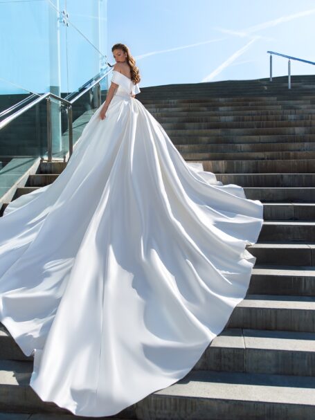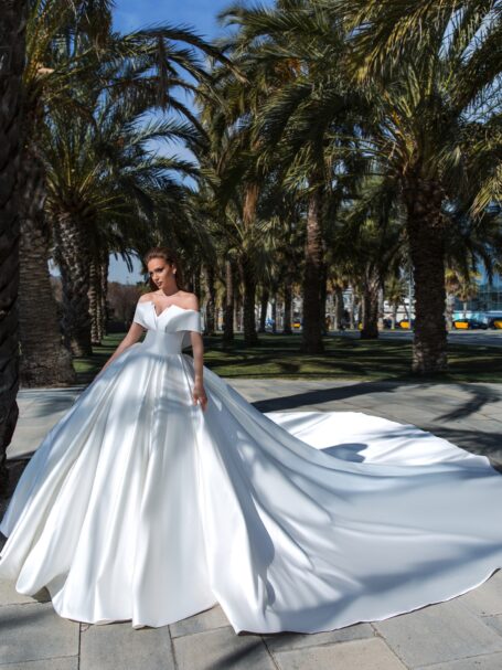 A magnificent train completes the ensemble, flowing elegantly behind the bride and leaving a lasting impression. The Odisea is a true celebration of confidence, power, and modern luxury.