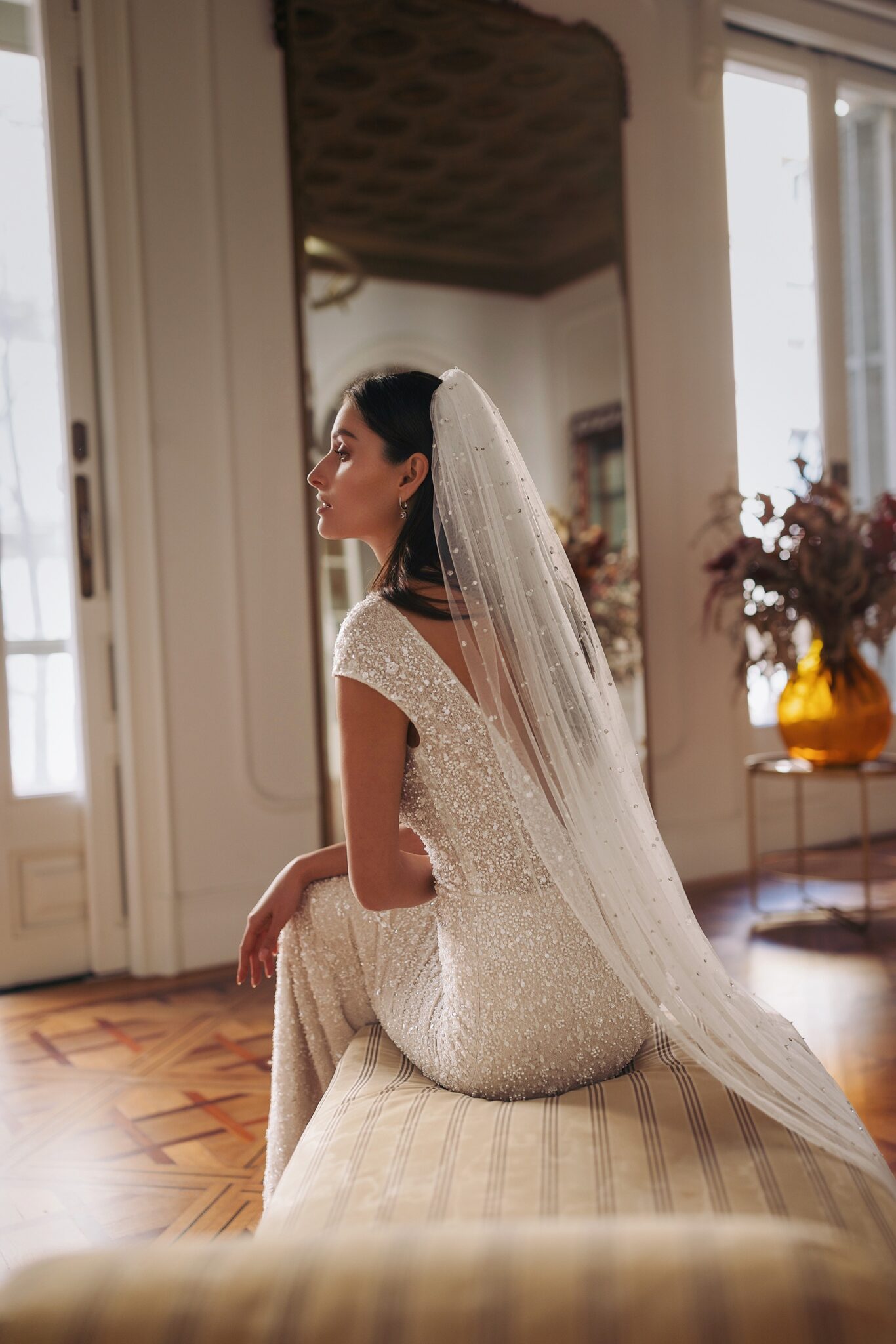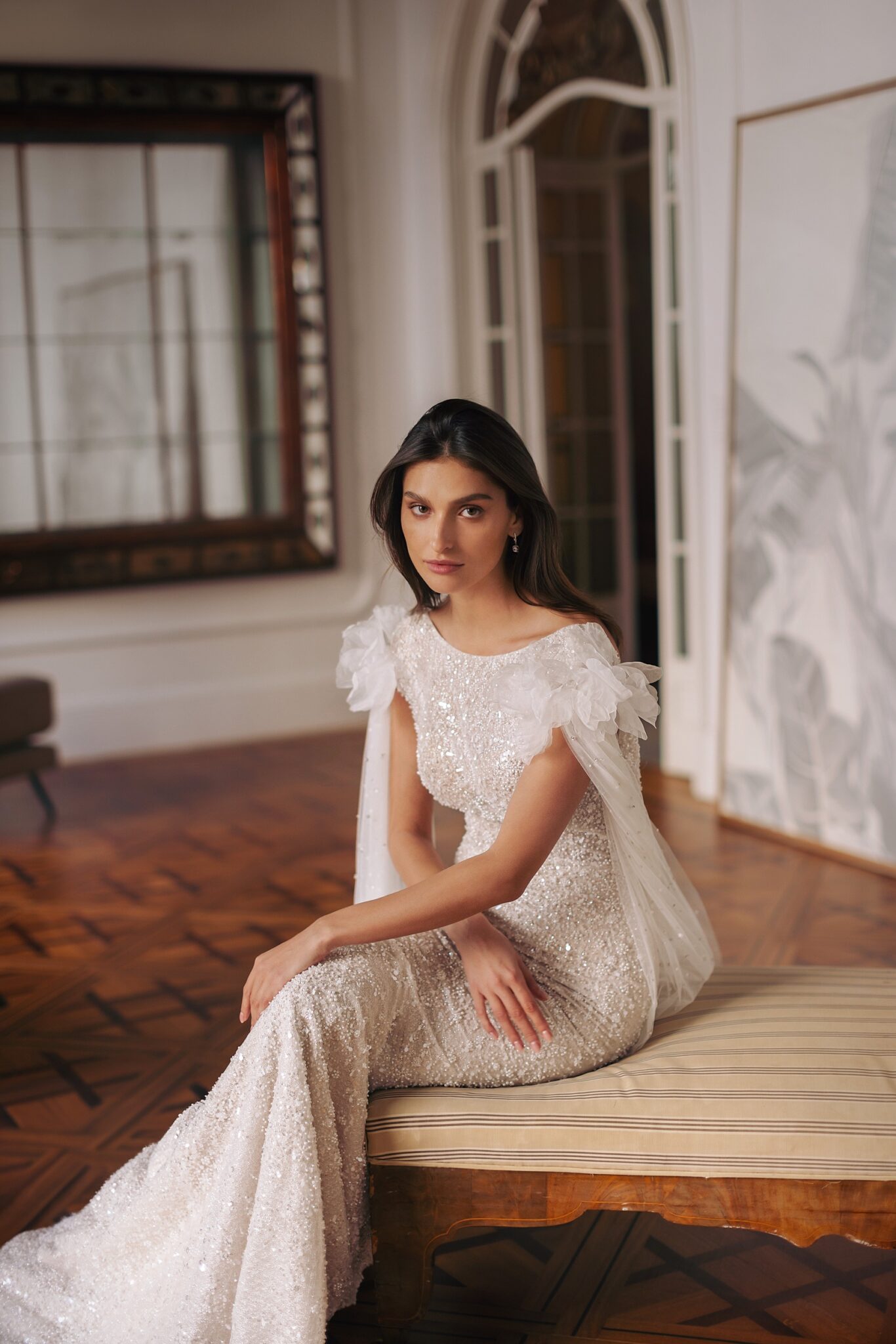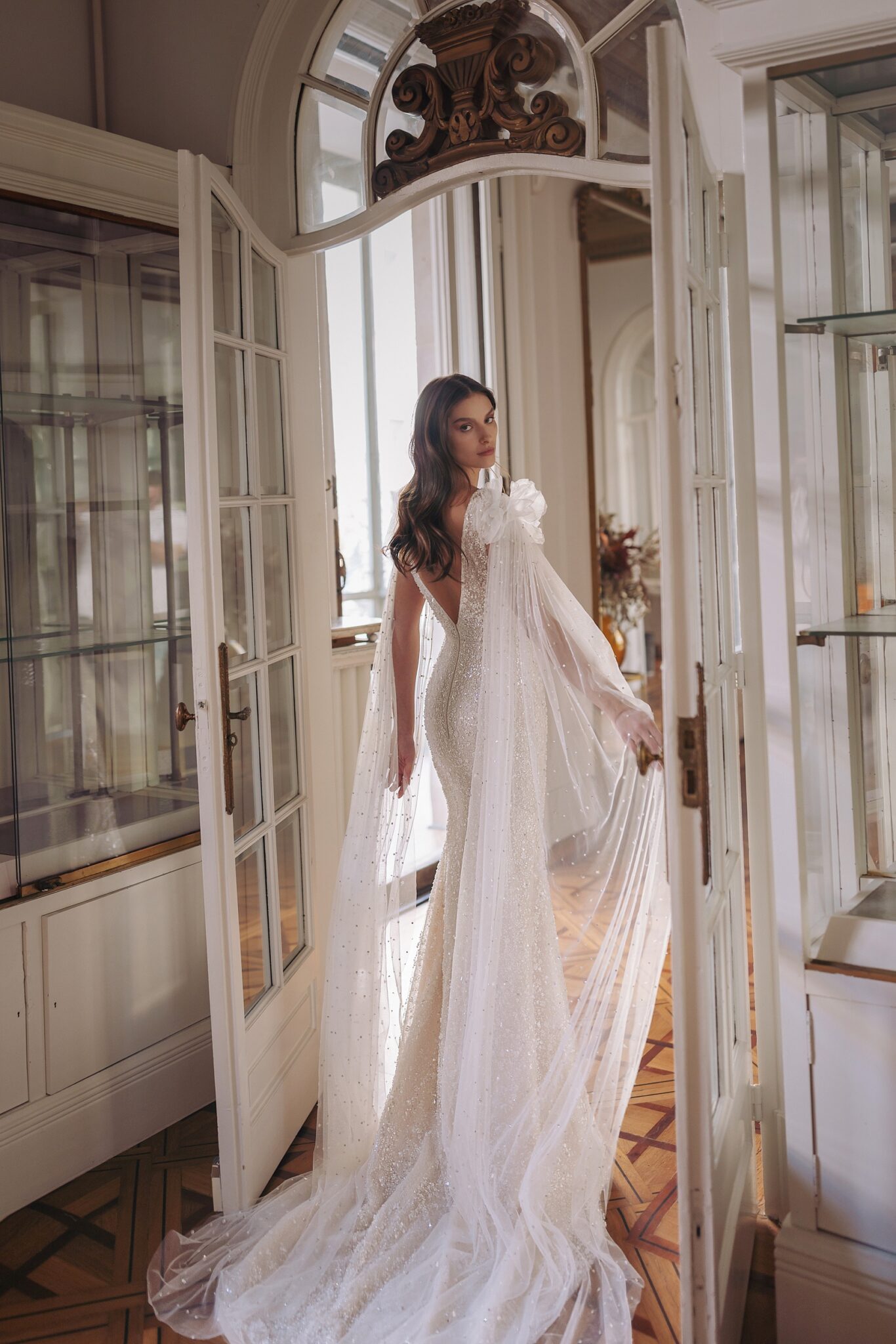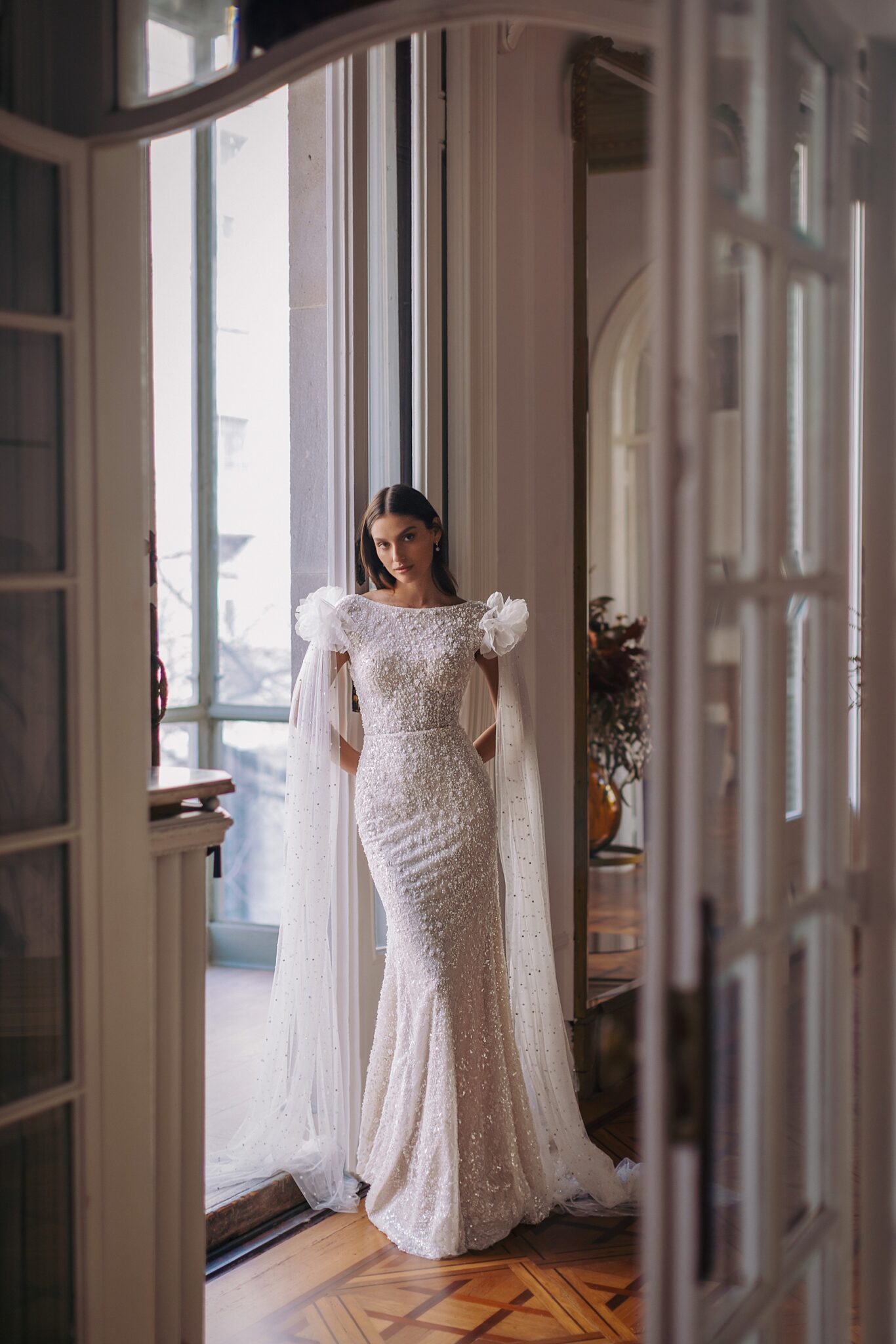 GeminiOleen — mermaid silhouette with boat neckline and short sleeves and rich embroidery all over the dress. Complemented with detachable tulle sleeves, voluminous on the shoulders and added sparkle with shiny beads — can be transformed into the veil.