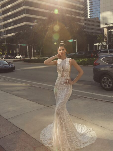 Miami, Plus SizeGorgeous Olivia wedding dress with a fabulous skirt and long train. This gown is made of luxurious fabric and entirely embroidered with spangles, beads, and crystals. They create an interesting pattern throughout the length of the dress. There are short sleeves, a V-shaped low neck, and a rounded neckline at the back of the dress. A skirt passes into a train.