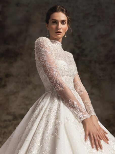 Notte d'Opera, Plus SizeThis statement all covered with embroidered lace ballgown features a deeply plunged strapless corset with exposed boning and sexy off-the-shoulder wrap sleeves. A voluminous box pleated skirt trickles down into a dramatic, pointed cathedral-length train.