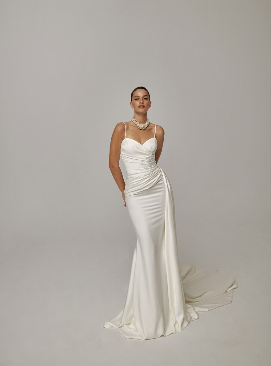 White EditOpium gown is a captivating satin mermaid silhouette designed to highlight every graceful curve.