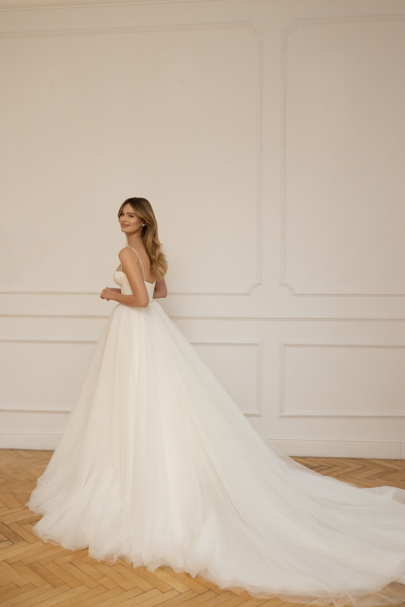 Less is more 2023Orli shows that simplicity is powerful in bridal fashion. This dress has been expertly crafted with soft crepe and weightless Tulle which add to the drama of her flawless A-line skirt featuring a gorgeous cathedral train in butter soft Tulle. The statement neckline with deep plunge and thin spaghetti straps covered with sparkling elements brings balance to the dramatic structured bodice