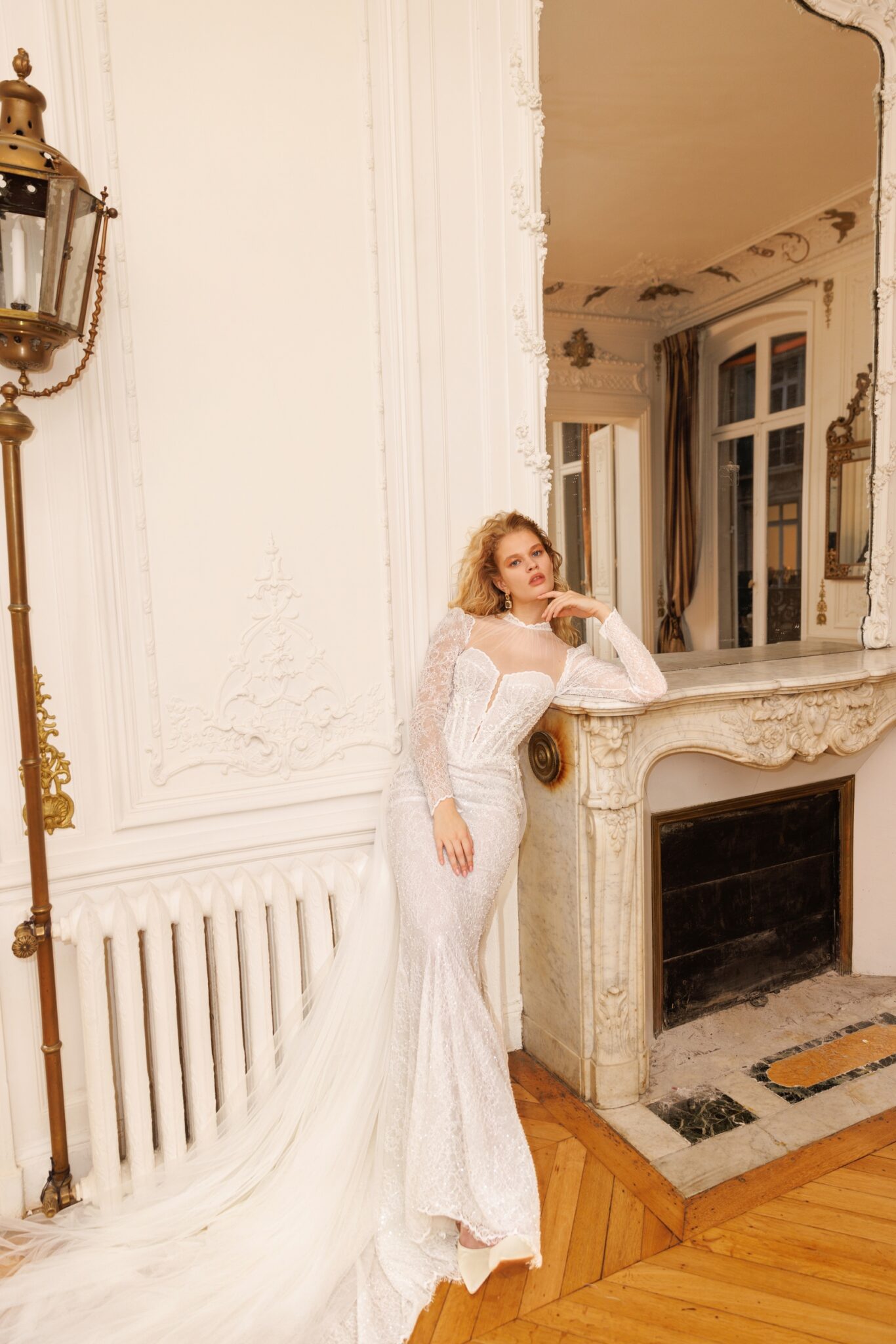Atelier LumiéreAnother opera of artistry and design: deep plunge cold-shoulder neckline, cut-out sides adorned by floral lace over the tulle base and neat silhouette create a harmonious style. Detachable lightweight cape gives a touch of simplicity to the meticulously laced and beaded dress.