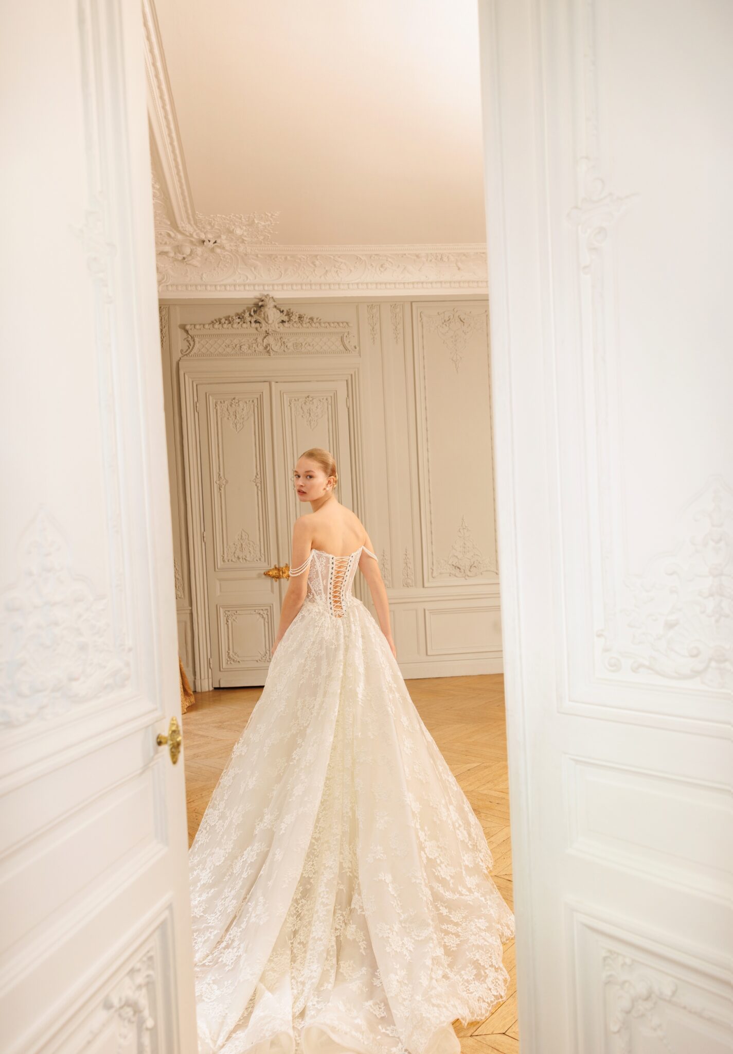 Atelier LumiéreFine and delicate style featuring long-sleeve turtleneck top with simple mesh on the chest and delicate lace decoration around the neck and all over the sleeves and corset. Fitted skirt made of same lace fabric descends gracefully in soft flres to the bottom. Detachable overskirt made of semi-sheer fine fabric is a final touch of tenderness to this outstanding design.