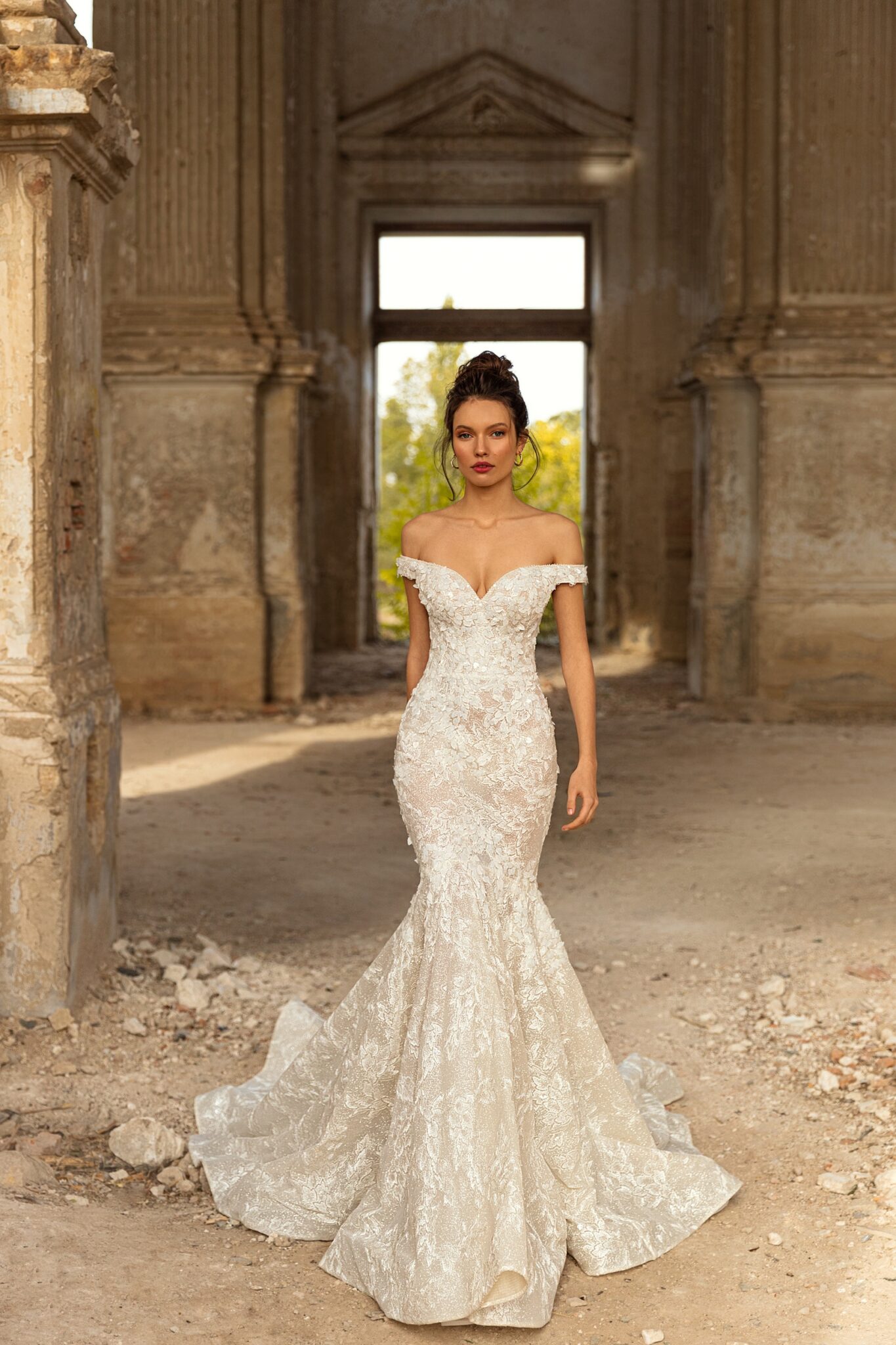 Golden HourPaola gown is mermaid silhouette dress fully decorated with shiny lace. The off shoulders sleeves and sweetheart neck line are making this dress romantic and tender.