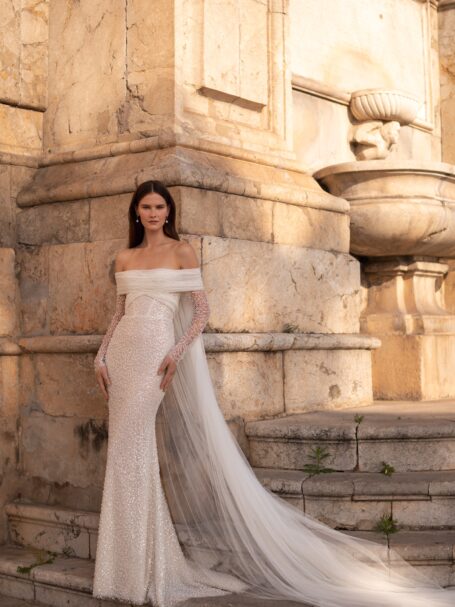 Palermo, Plus SizeA skin-tight gown with sweeping train, sweetheart neckline and off-the-shoulder long fitted regal sleeves. All covered in sequins and crystal pendants Parvin features spectacular embroidered patterned lace. Accessorized with a fantistic satin overskirt, it takes on extra volume for a grand down-the-aisle entrance.