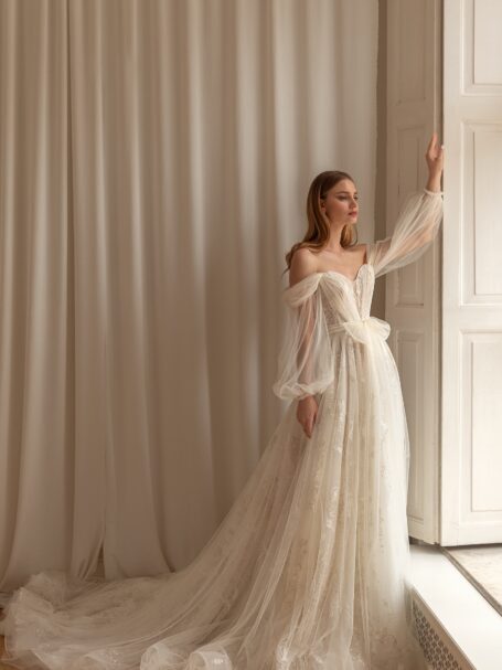 Less is more 2022, Plus SizePerla is a fabulous and glamorous wedding dress that highlights the figure. This dress of mermaid silhouette is fully decorated with beads and artificial pearls. The deep V-shaped neckline accentuates the decollete and the thin shoulder straps follow to the uncovered back. The skirt is fitted on the hips and falls down to a full length. The shoulders are embellished with transparent wings that can be detached.