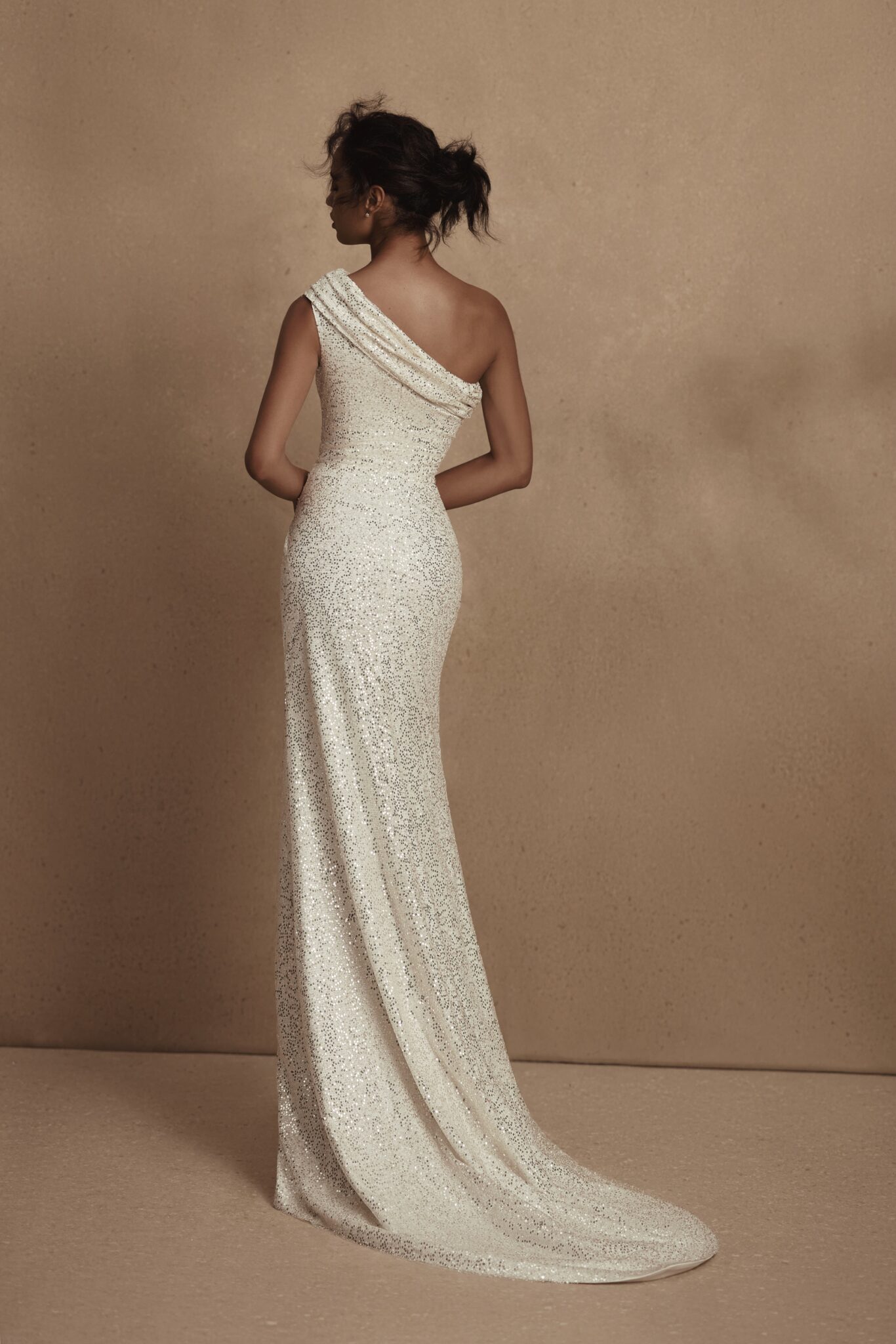 PersonalityPersia is a majestic wedding gown made of seqined fabric. The asymmetric corset is decorated with draping and shining spangles. The skirt is of Straight silhouette with a slit as a perfect way to show off a hint of sexuality.