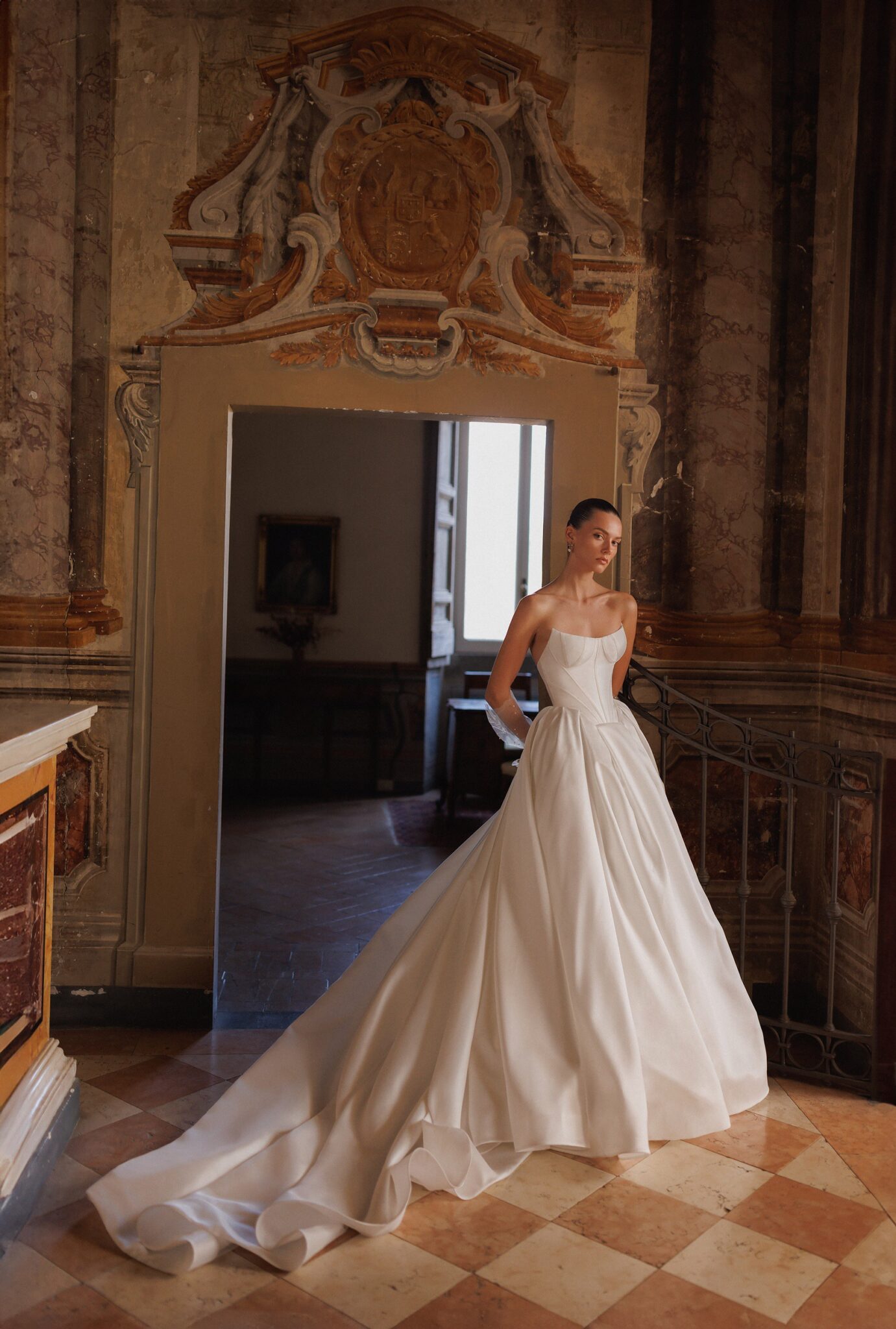 L'UnicoDeep round neck corset with pointed bottom and voluminous smooth fabric skirt.
