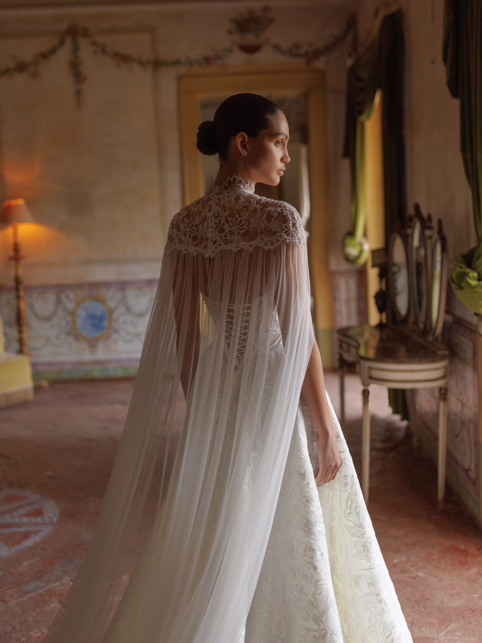 This dress comes with a detachable cape that fastens at the back with buttons. The lace elegantly covers the shoulders, while the flowing tulle cascades down the silhouette, adding a touch of ethereal beauty. The corset features a lace-up back, ensuring a perfect fit.