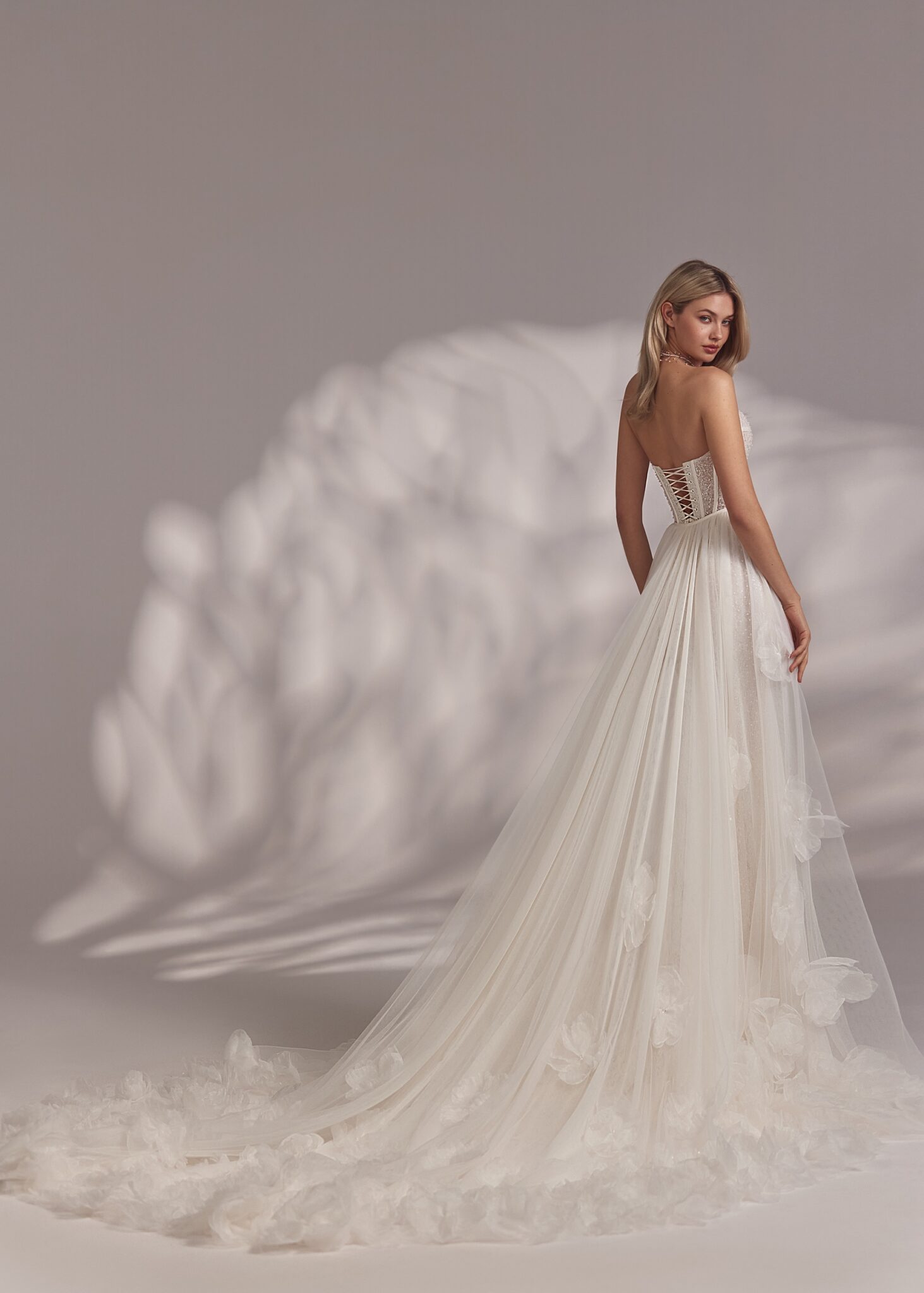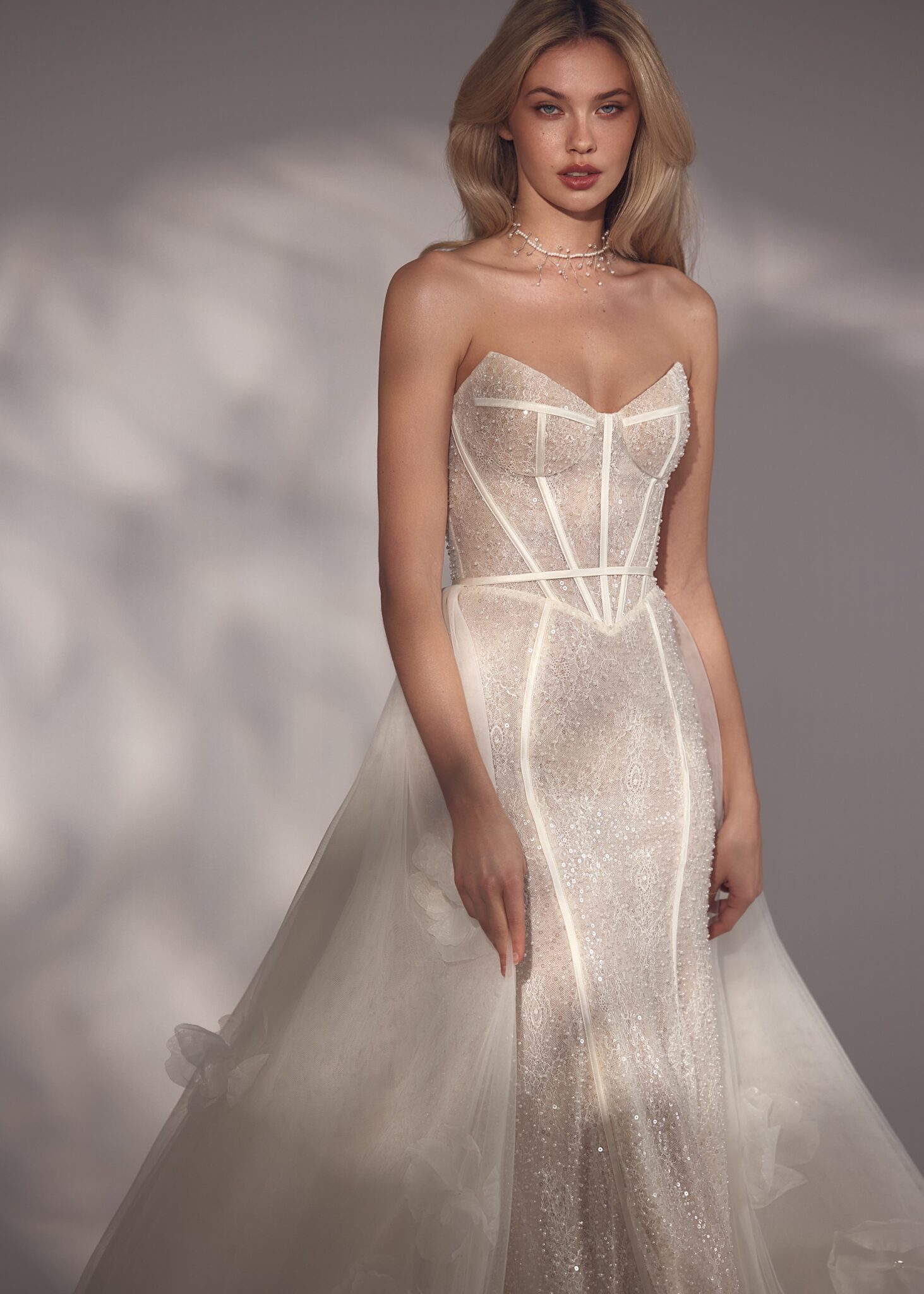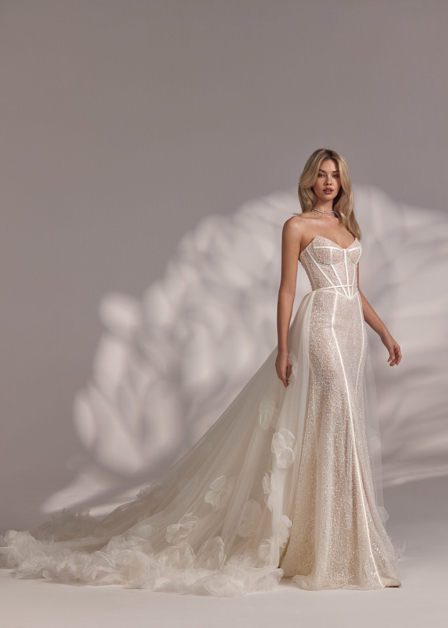 Less is More IVPorsha – beaded all-over strapless ballerina neckline detailed corset dress with basque waistline and straight skirt. Complemented with a detachable tuille overskirt decorated with voluminous flowers on the edges.