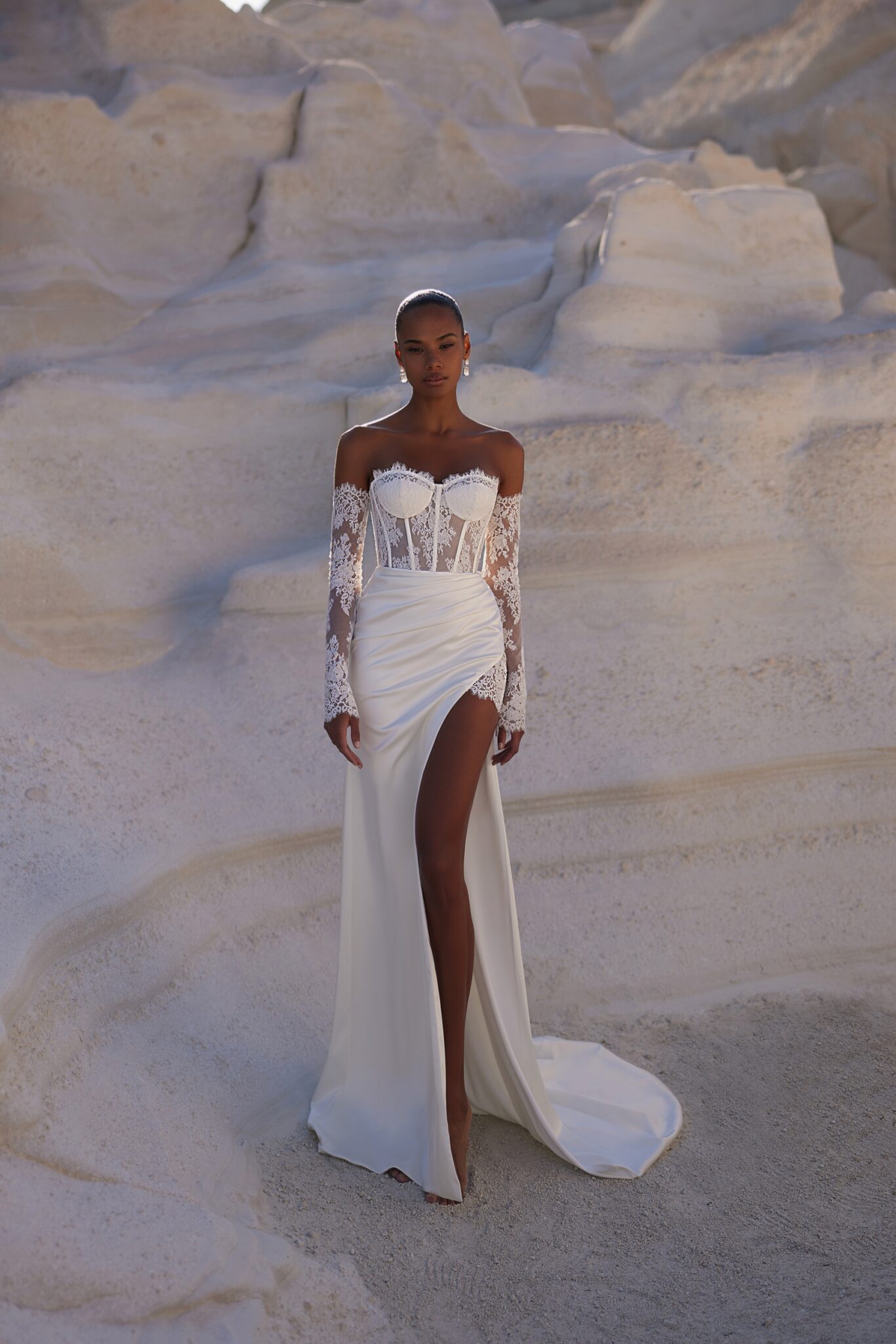 VenusExquisite dress, featuring a firm corset with a heart-shaped neckline, meticulously refined with floral lace. The satin fabric skirt features a slit on the left, revealing a delicate lace underskirt. Detachable lace sleeves adorn the arms, giving the look a polished touch.