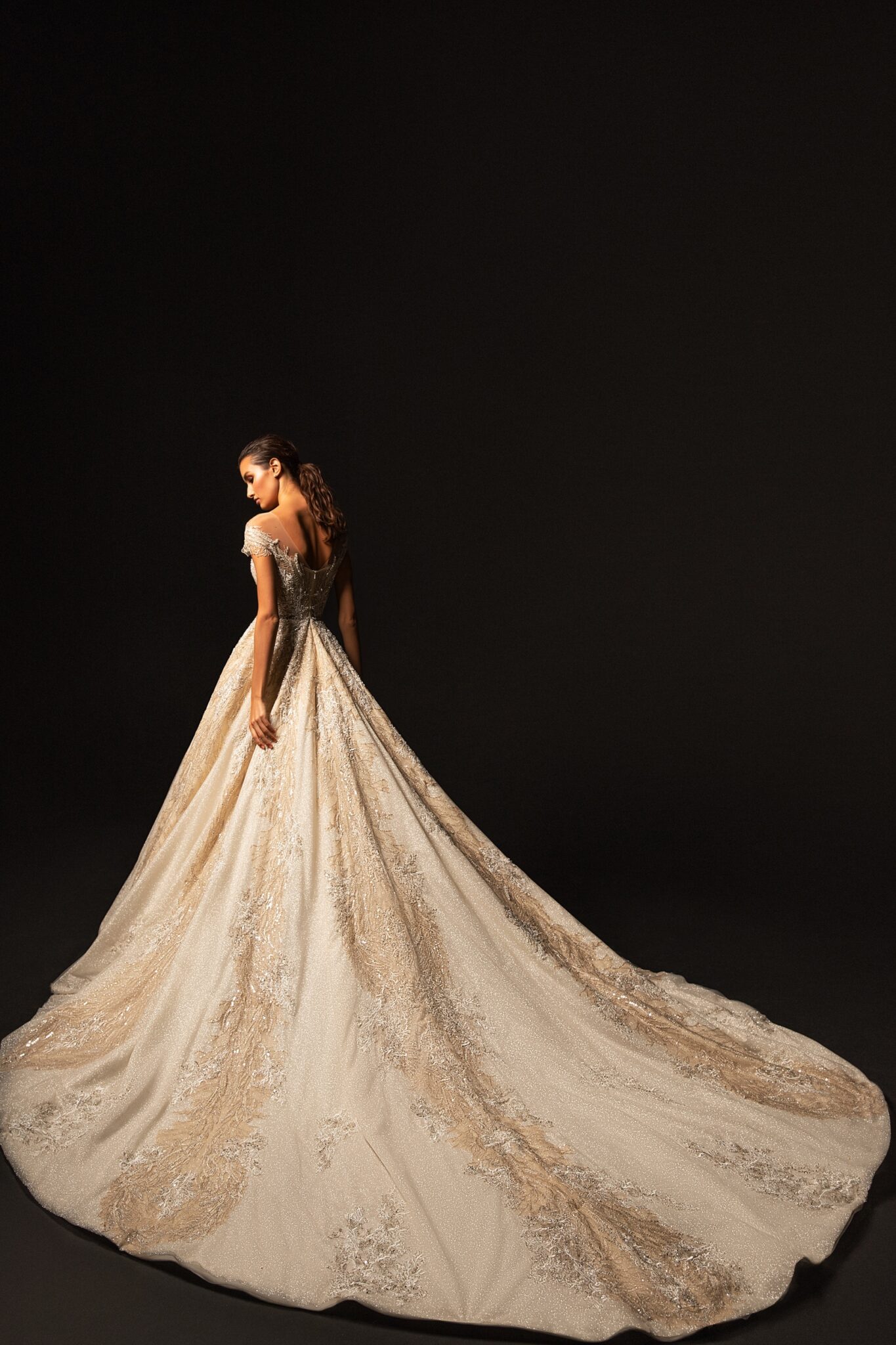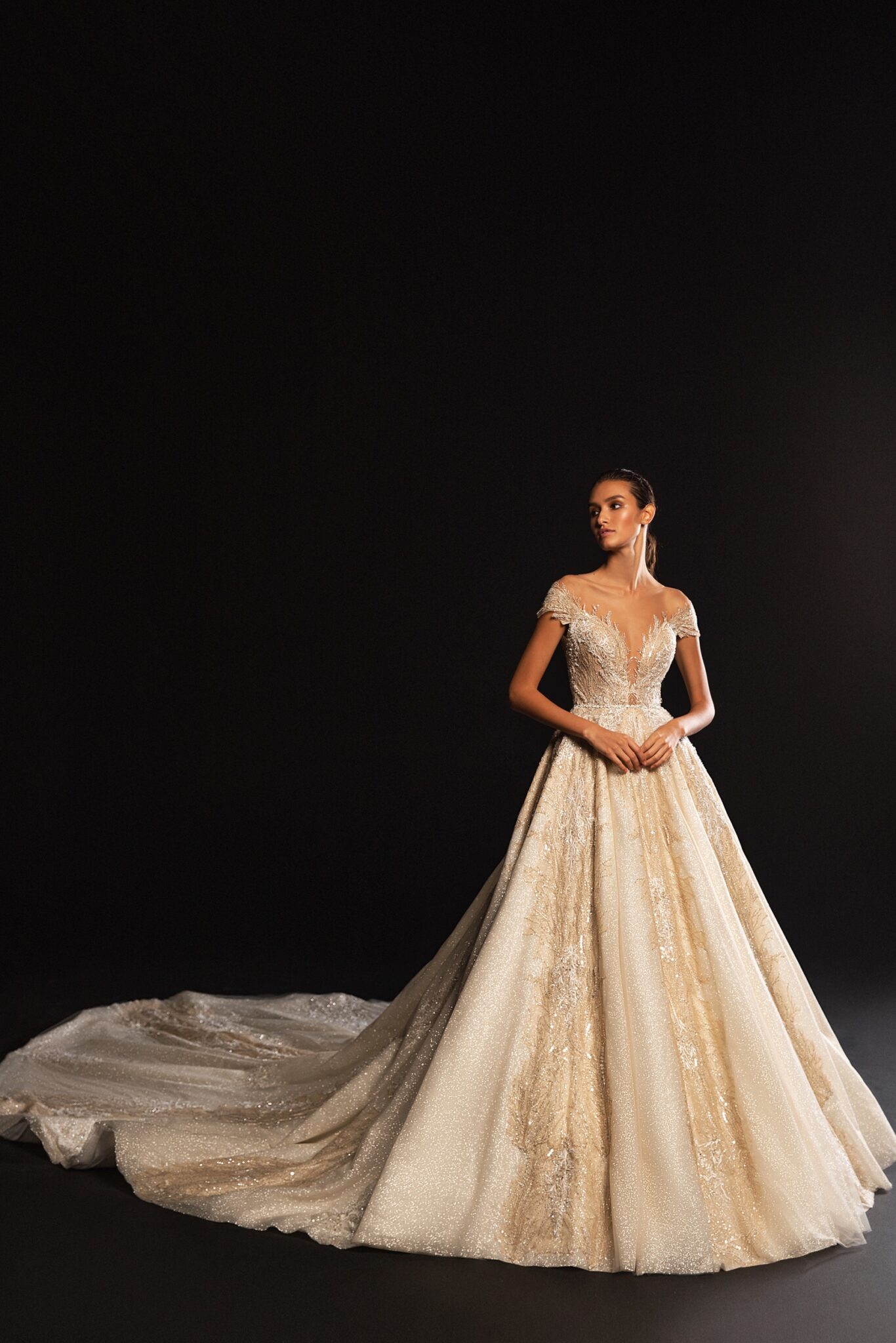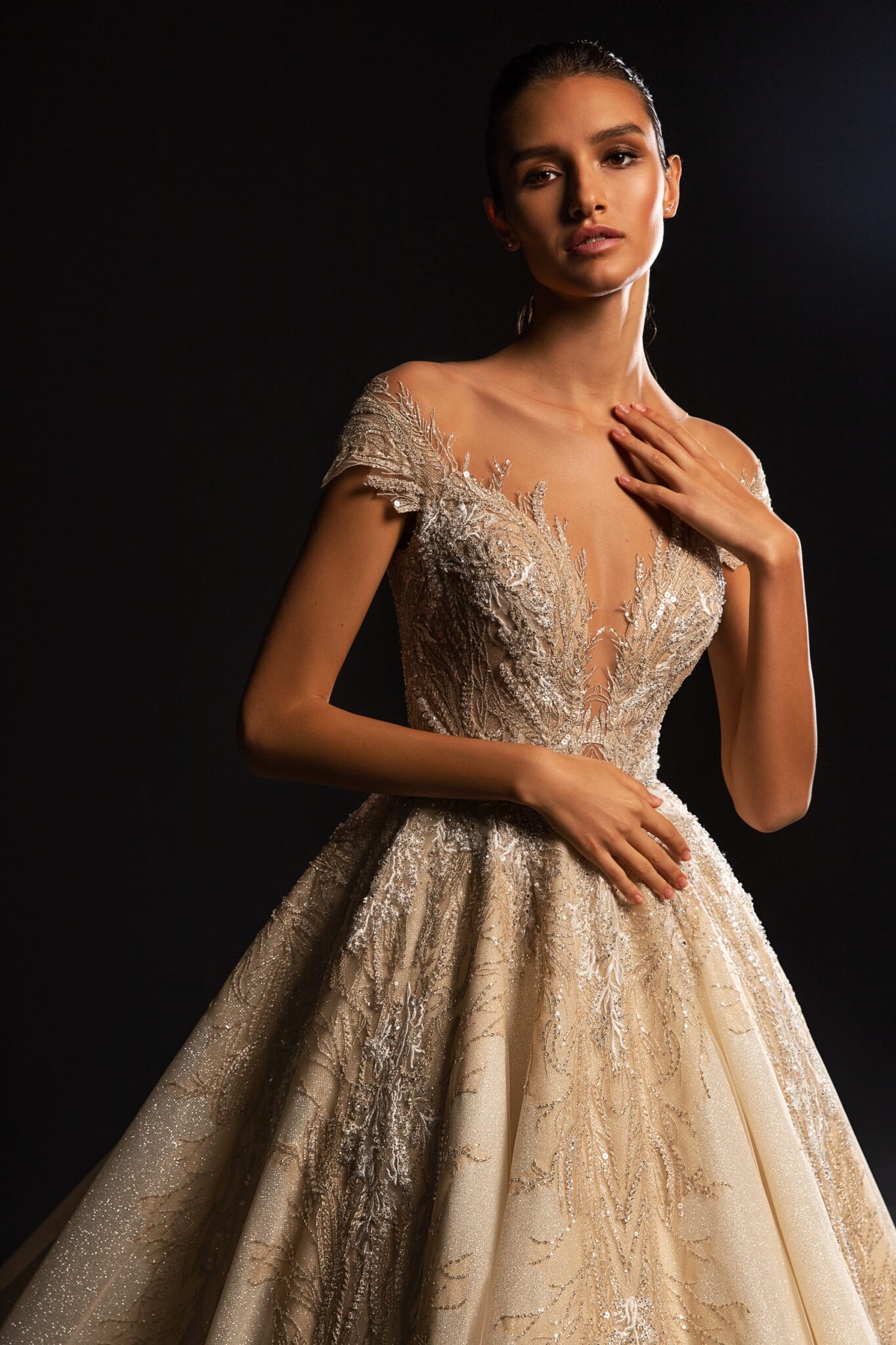 StardustQueen is a fabulous gown for a royal wedding look. The upper part of the dress is made of transparent fabric that is fully decorated with a pattern of shining crystals and beads. The dress looks feminine due to a deep neckline