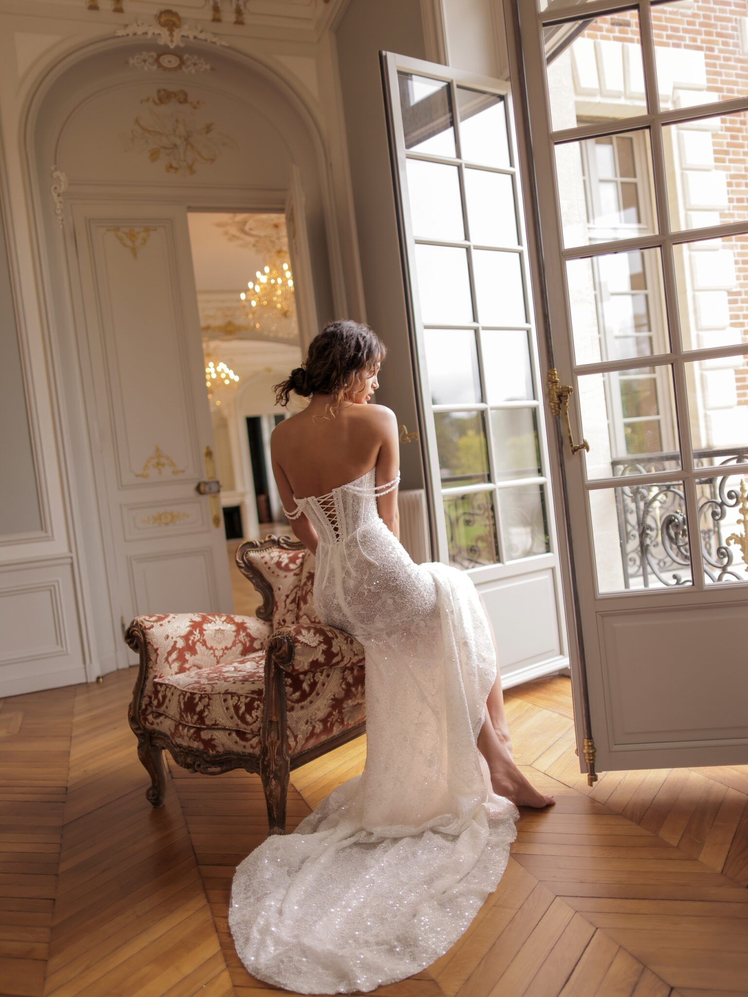 White SwanStrapless mermaid gown highlights the figure with intricate lace from the bust to the hips. The structured bodice features a sweetheart neckline and detailed corset, enhancing the waist. A trail of shimmering sequins runs throughout the dress, while it’s fitted silhouette flares out into a graceful train.