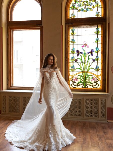 RomanceLuxurious Raquel bridal gown is a combination of classic motives and modern trends. A classical mermaid dress is made of lace flowers that create a tender pattern. Deep V-shaped low neck and short sleeves accentuate delicate collarbones. The fabulous skirt is made of organza reminds sea waves. A mermaid wedding gown is decorated with lace flowers.