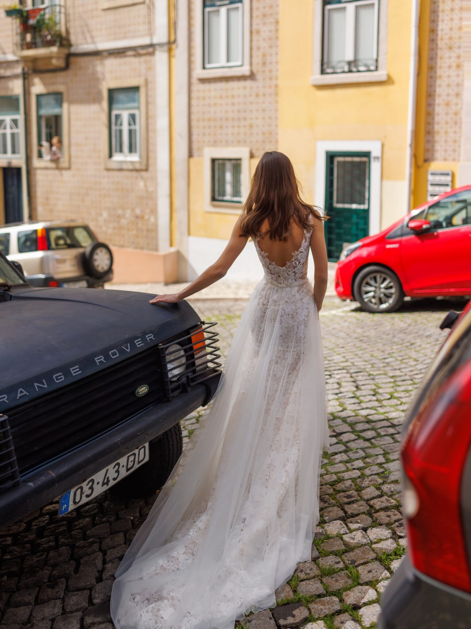 With its open back and refined short train, Renee is the perfect blend of sensuality, elegance, and modern bridal design.