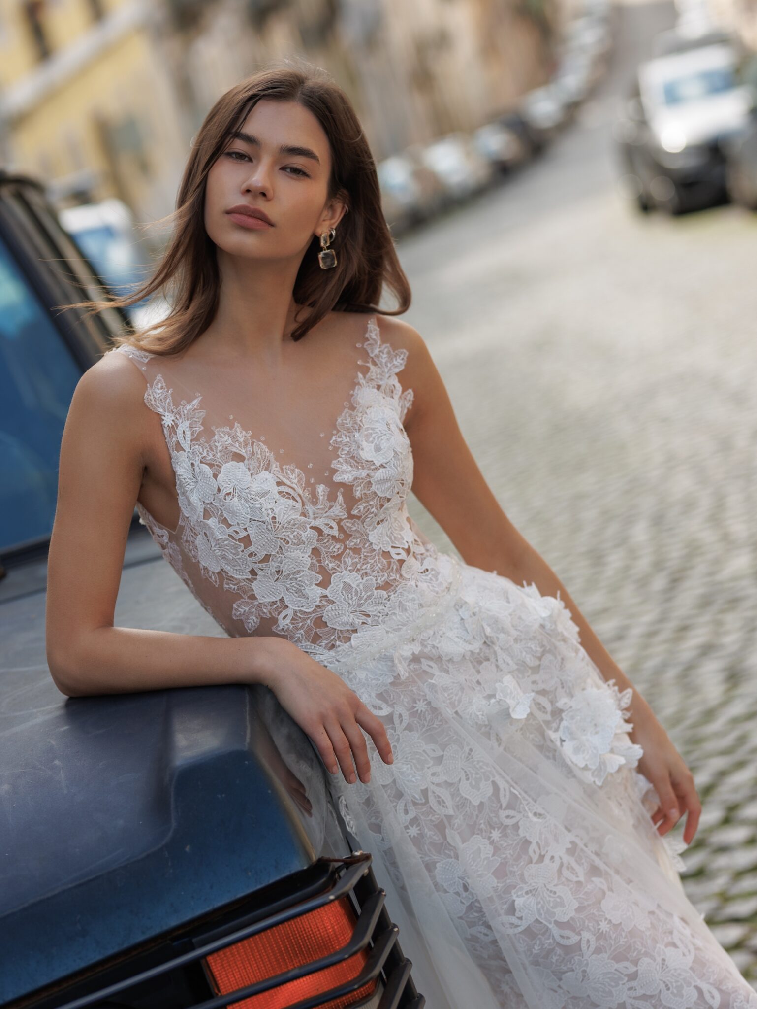 Crafted from exquisite lace, the gown features a detachable tulle train adorned with delicate 3D floral appliqués, adding whimsy to the look.