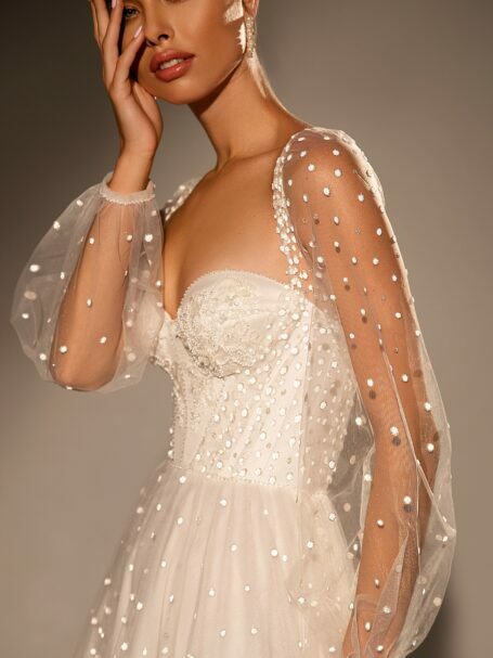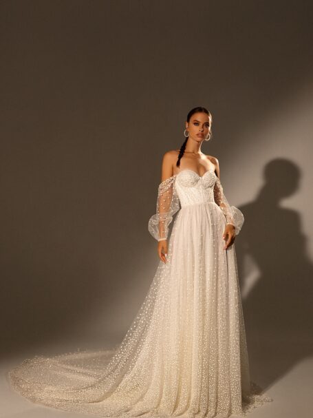 MuseA tender and laconic wedding gown with spectacular lace and embroidery. A bodice with lowered shoulders has a V-shaped neckline. It is decorated with a floral pattern and embroidered with beads and spangles. This fabulous skirt passes into a long train. Lace wedding gown looks fabulous. Lowered shoulders and a low neck look tender and romantic. Corsage with lowered shoulders is made of sophisticated lace. Veiling insets on the corsage looks fantastic. The long magnificent tail is worth noticing.