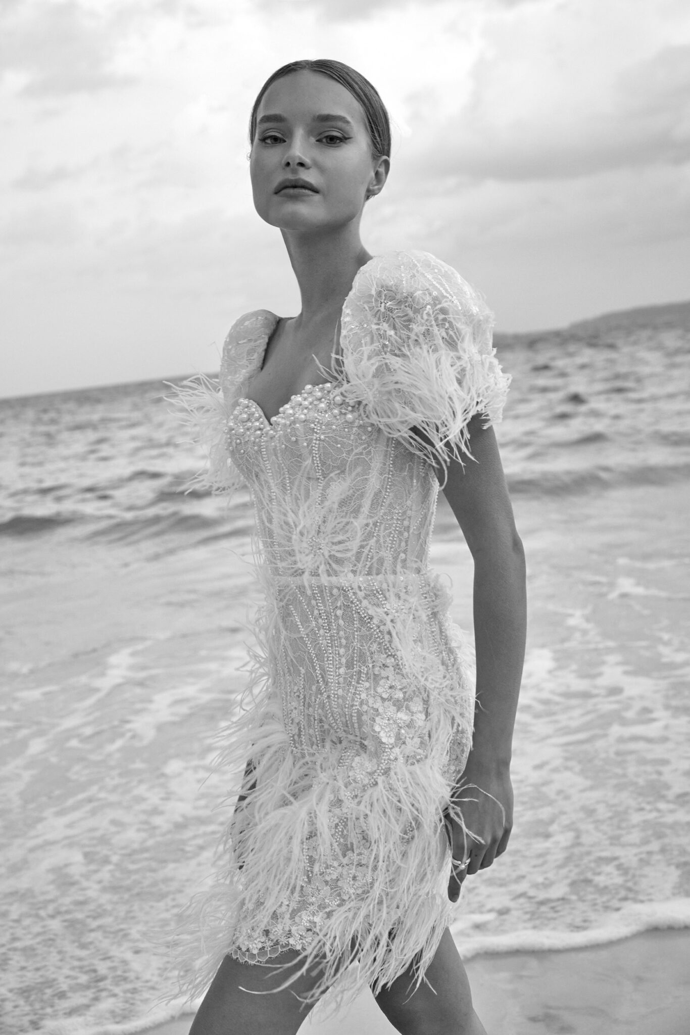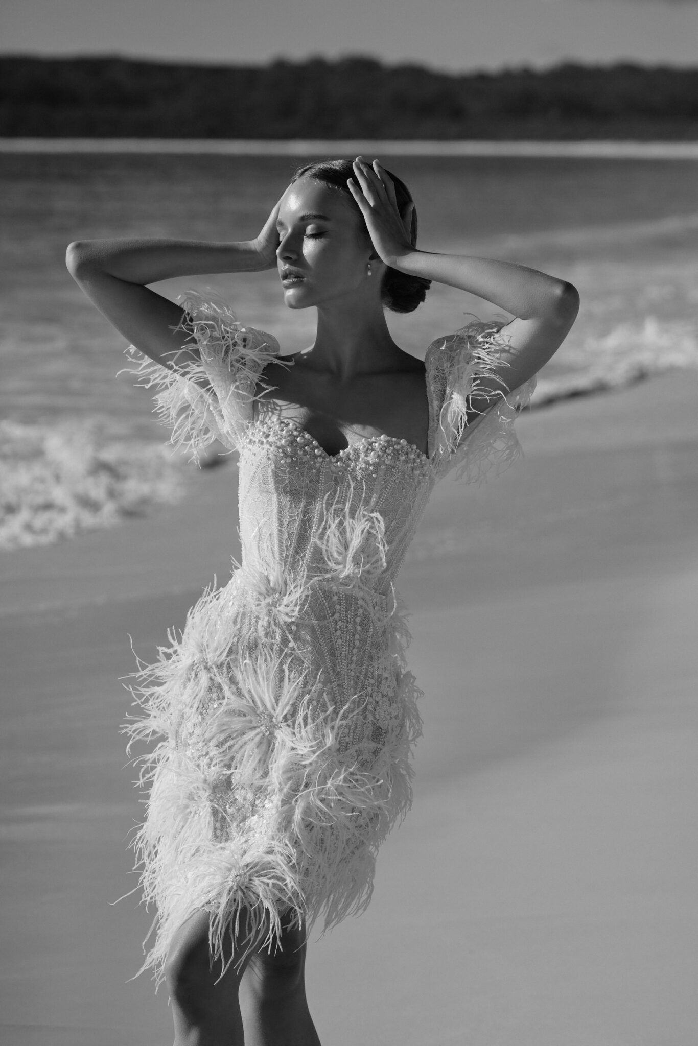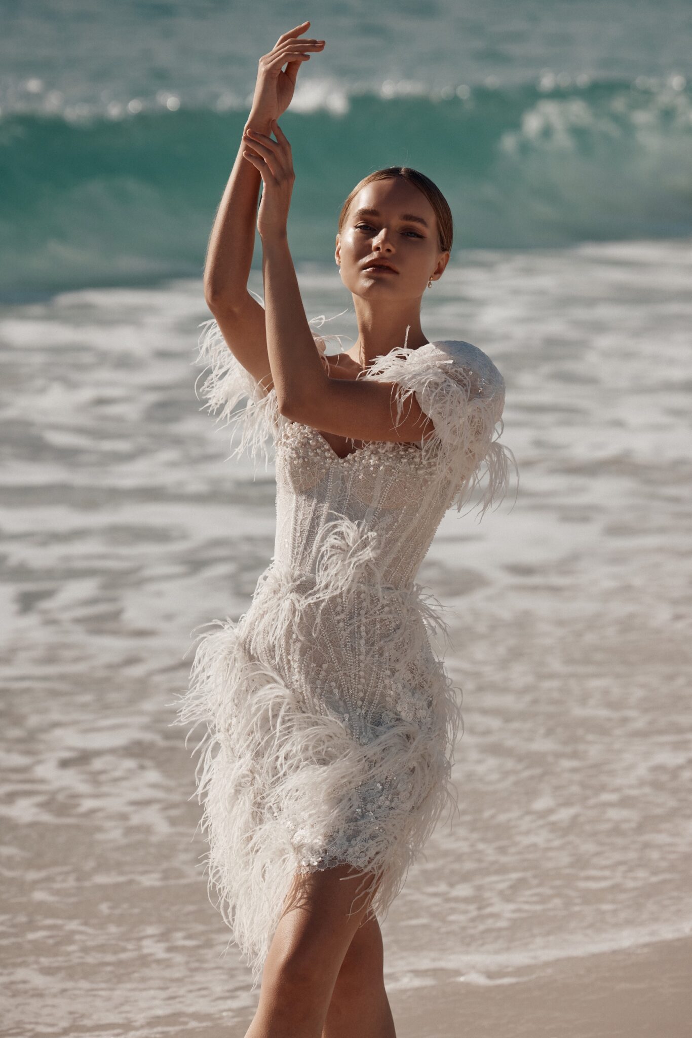 Atelier signature editionThis mini-length wedding dress is a dazzling showstopper, bedecked in shimmering beads, pearls, and enchanting feather appliques. The sweetheart neckline adds a touch of classic romance, while the cap sleeves adorned with feathers give it a unique and extravagant flair. Perfect for the bride who wants to make a bold and unforgettable statement.