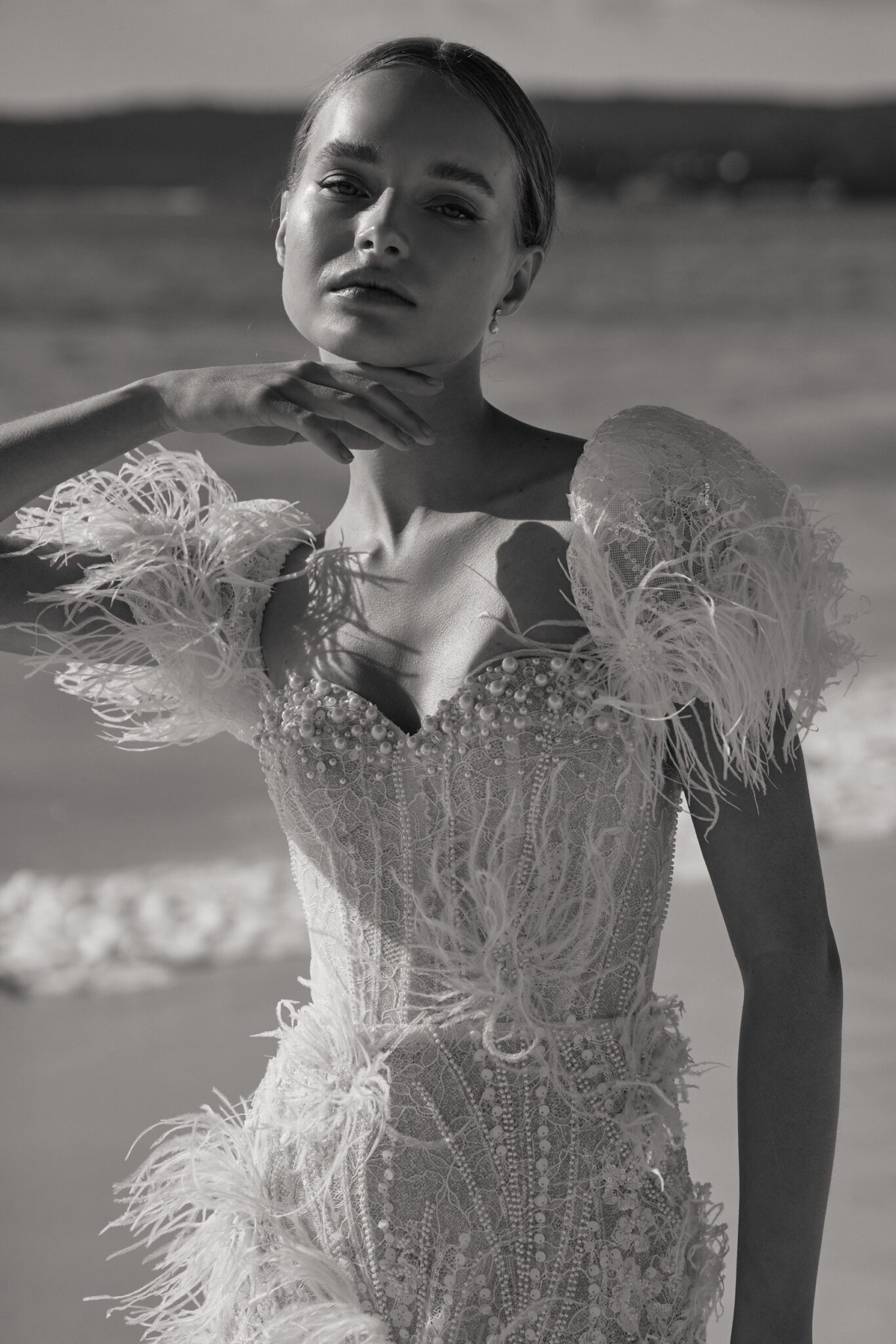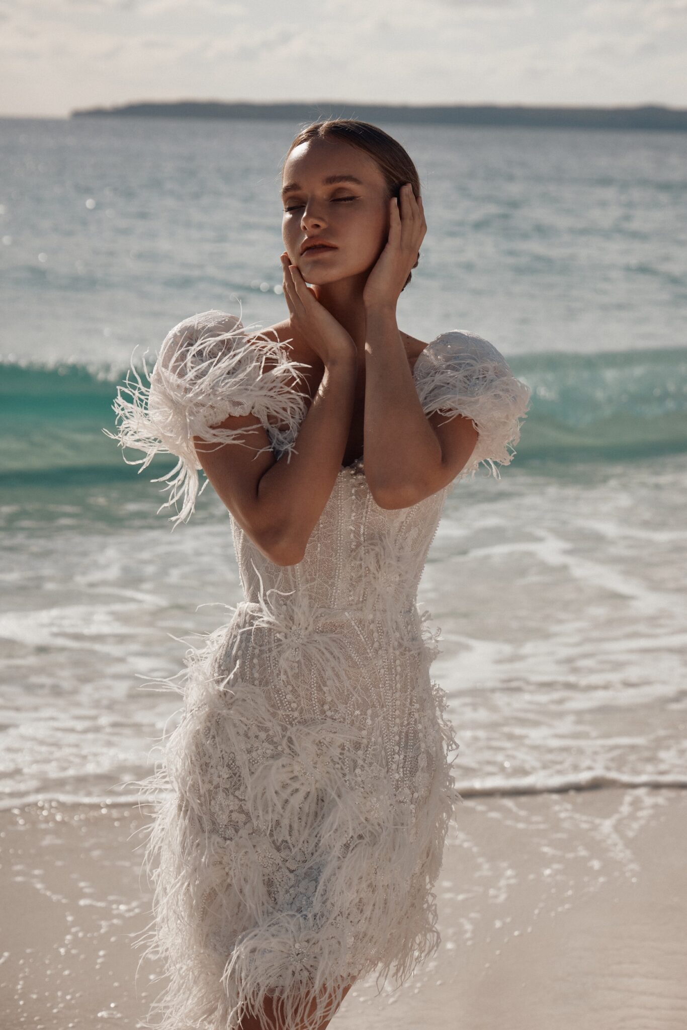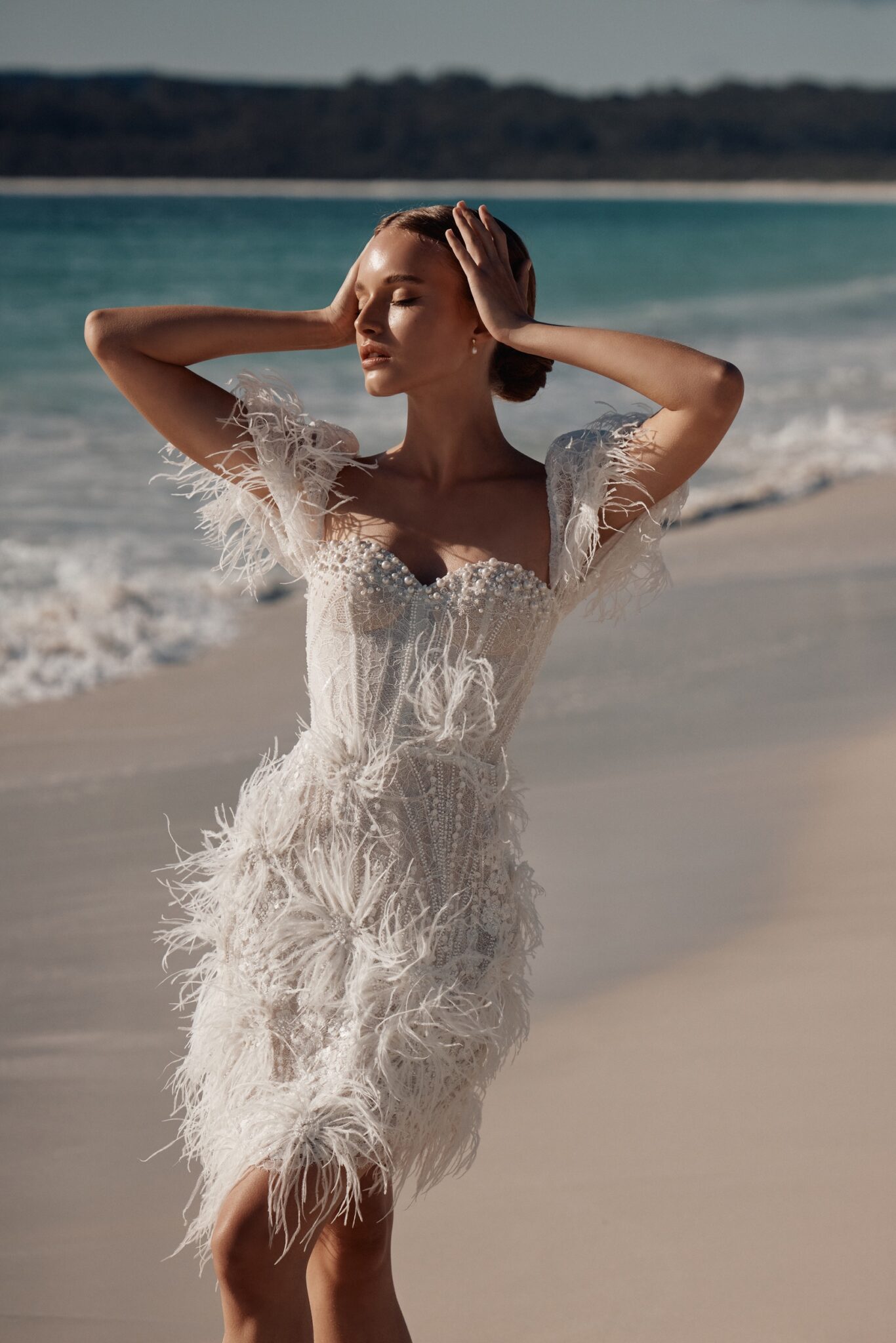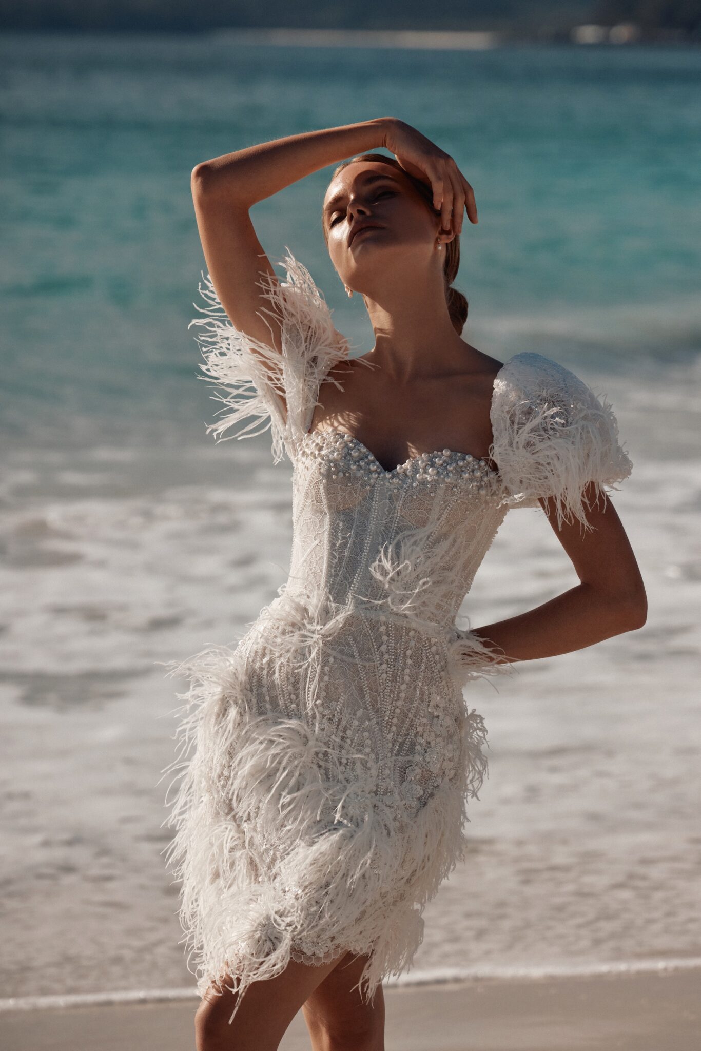 Atelier signature editionThis mini-length wedding dress is a dazzling showstopper, bedecked in shimmering beads, pearls, and enchanting feather appliques. The sweetheart neckline adds a touch of classic romance, while the cap sleeves adorned with feathers give it a unique and extravagant flair. Perfect for the bride who wants to make a bold and unforgettable statement.
