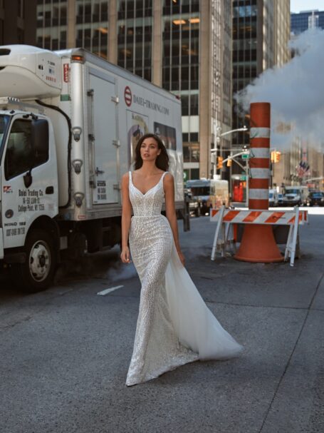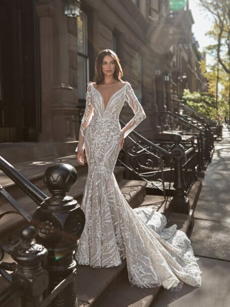Love in the City, Plus SizeTender Rochelle wedding gown is made of exquisite laced fabric. The corset is embellished with a sweetheart neckline and lowered shoulders. The lace inserts decorate the corsage and the lowered sleeves. The skirt is fitted on the hips and continued with geometric inserts of lush Tulle which pass into a fantastic train.