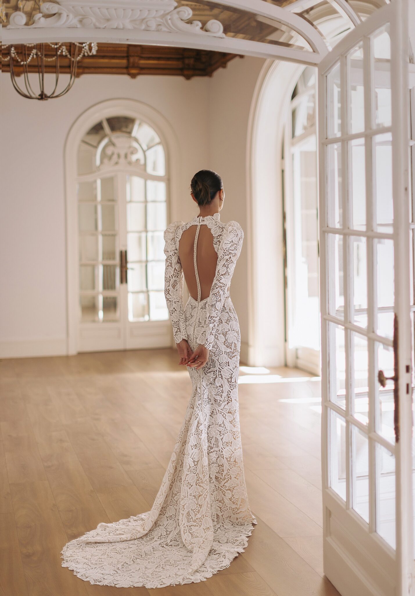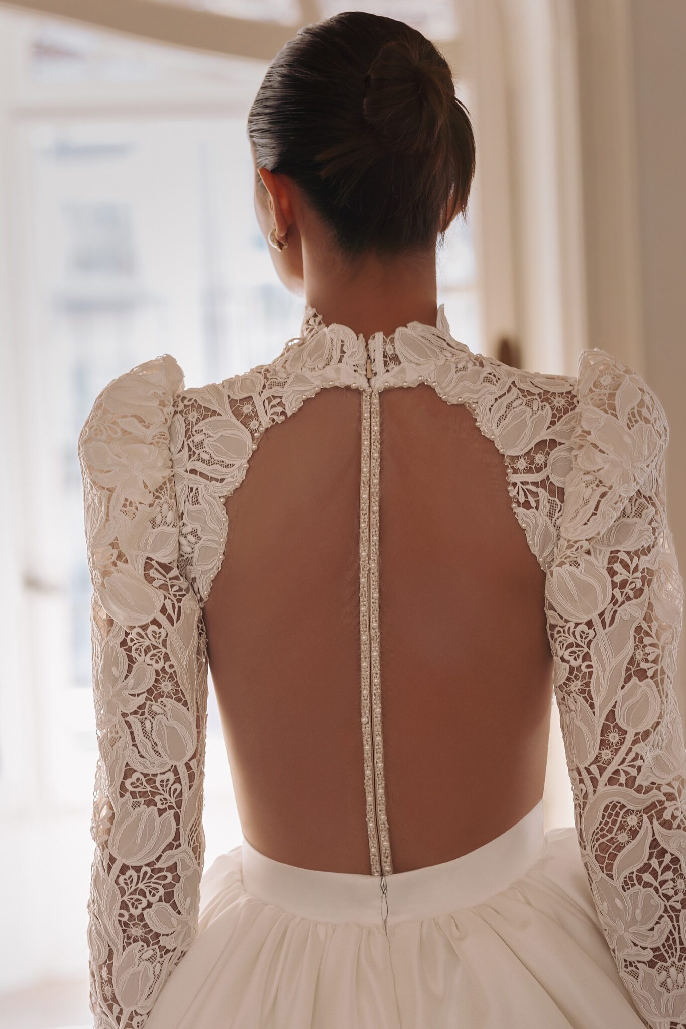 GeminiRodeo — guipure lace fitted mermaid silhouette turtleneck dress with long sleeves cut out sides and open round back with thin shiny straps from the neck to the bottom. Complemented with detachable smooth upper skirt open in the front and covering the back and sides.