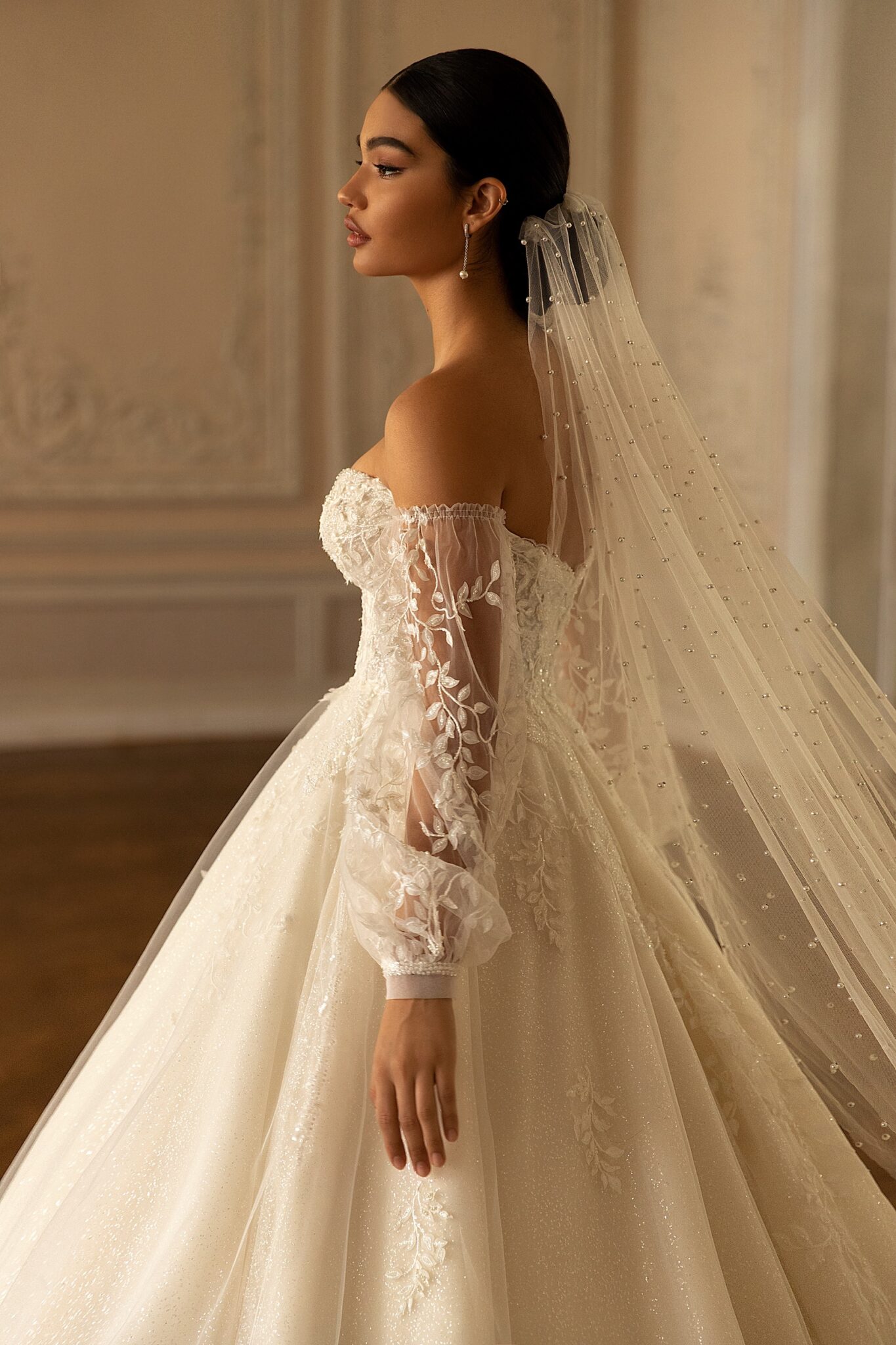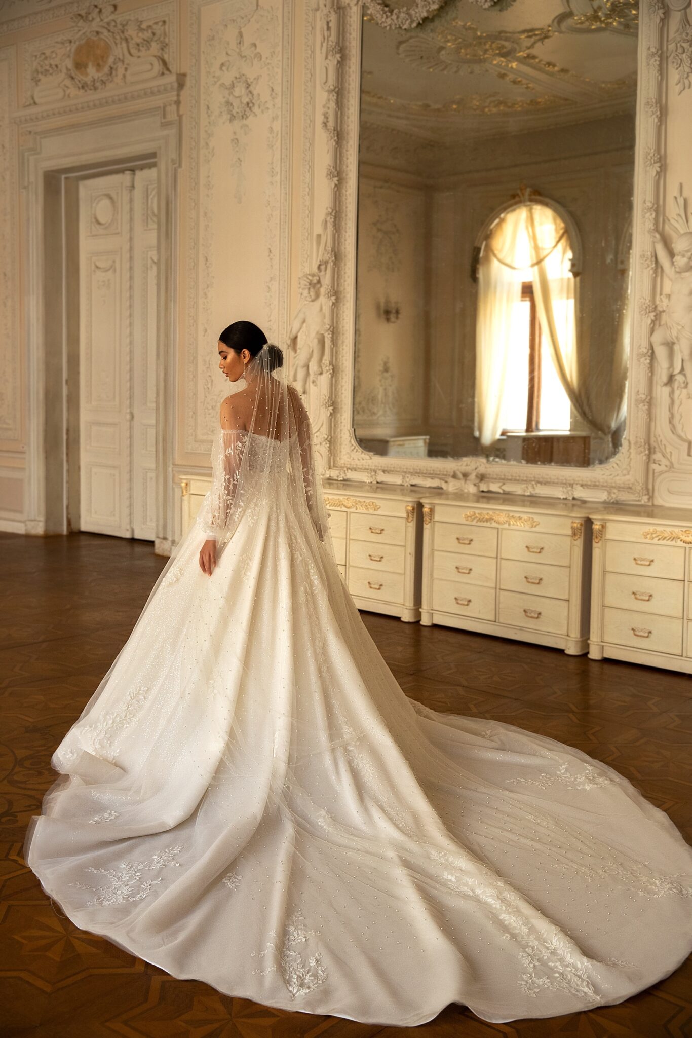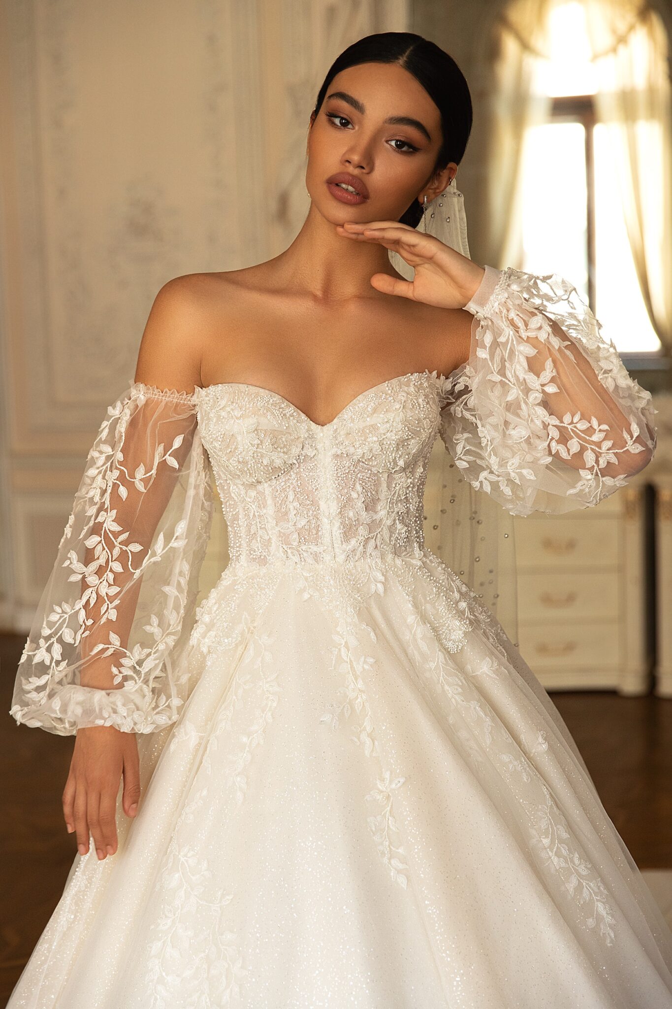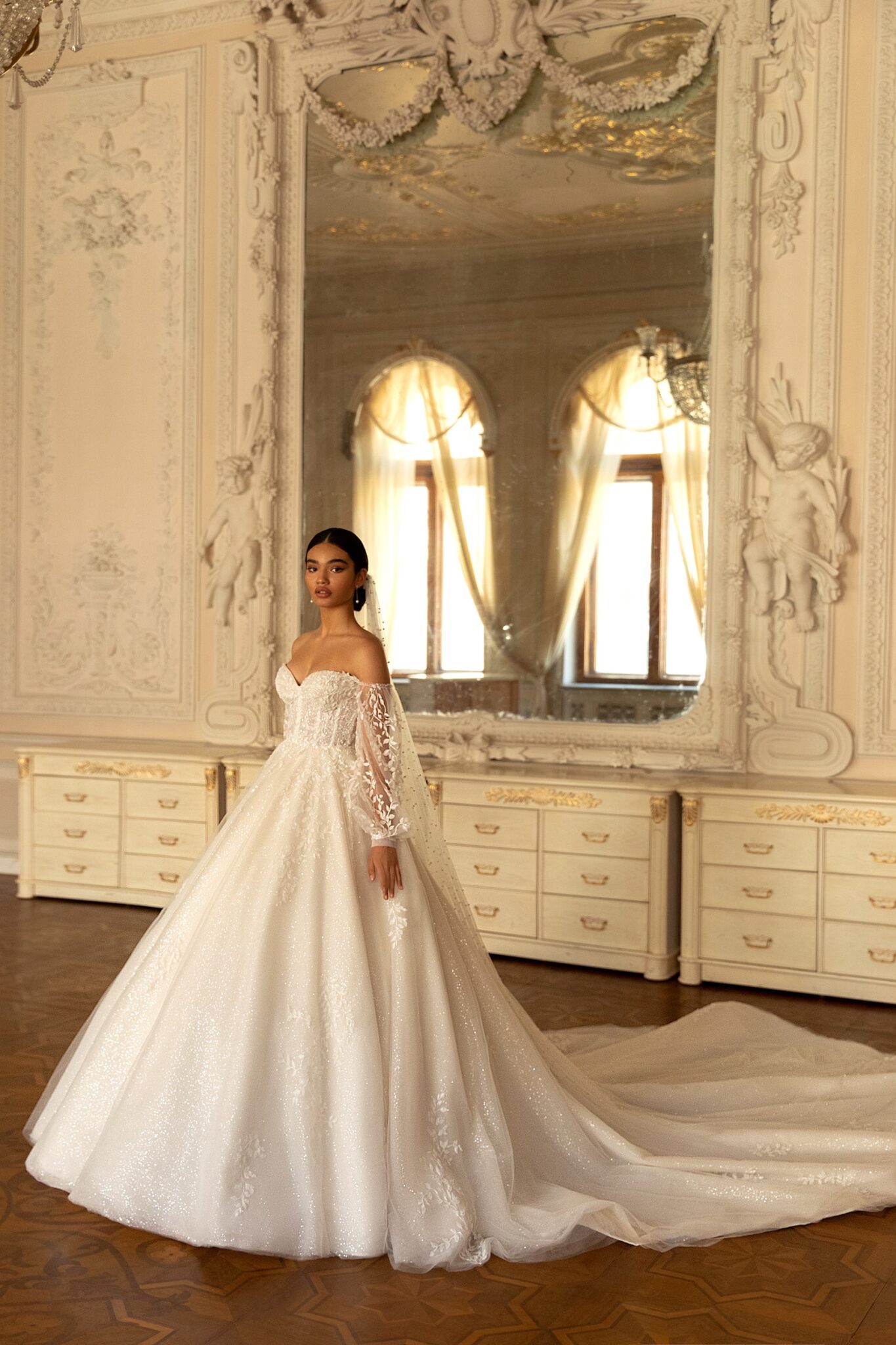 RomanceRomance ball gown reminds a wedding dress for a real princess. Strapless lace corsage is decorated with small flowers. Those flowers are found at the back of the dress. Tender translucent sleeves are embellished with veiling bows. The veiling loose skirt looks fantastic. Veiling skirt is completed with veiling falbalas.