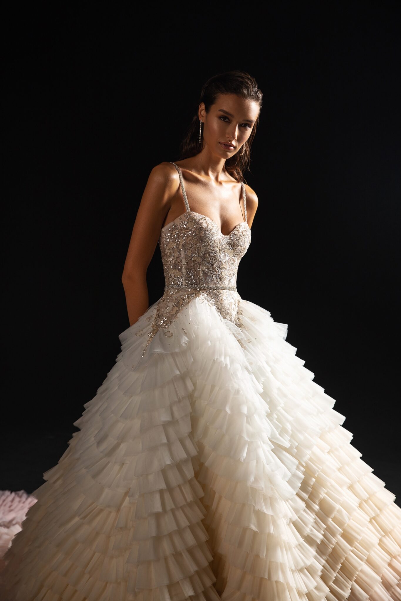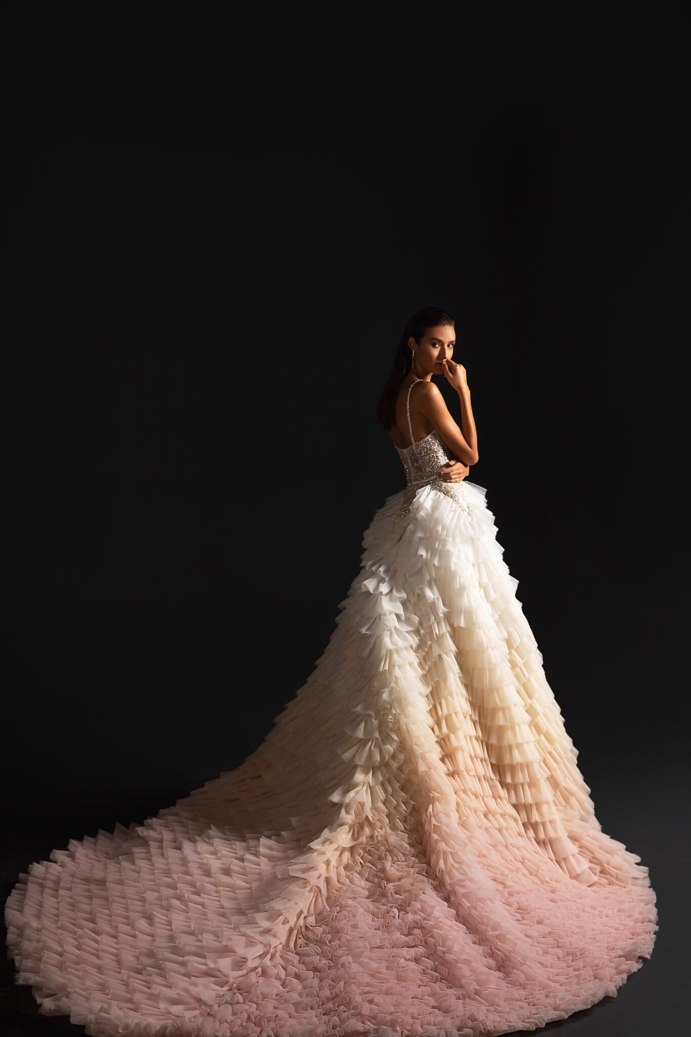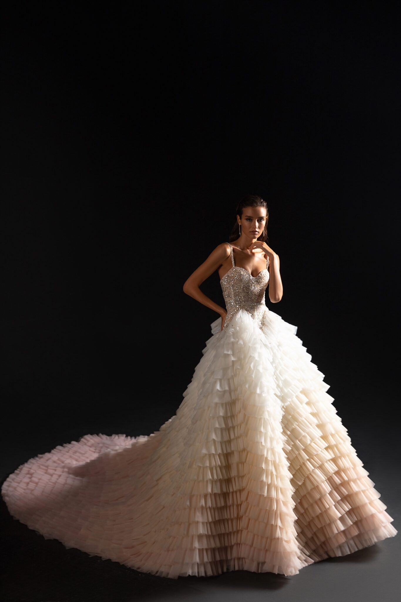 StardustA unique wedding gown with a fabulous train made of ruffles colorated in different shades of soft pink.. The corset of the dress and the dress itself are made of sparkly fabrics. A sheath dress is embellished with a sweetheart neckline and thin shoulder straps.