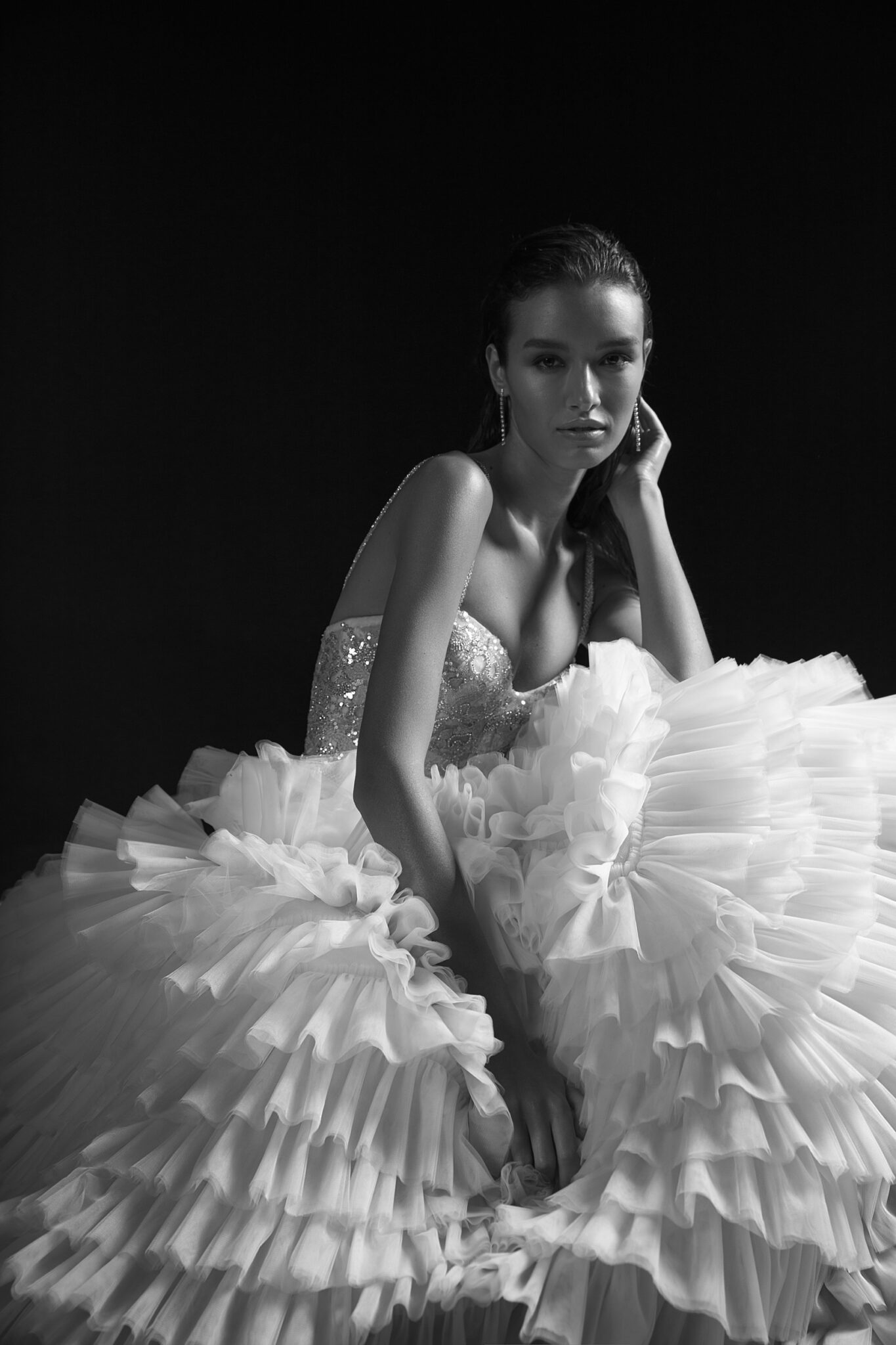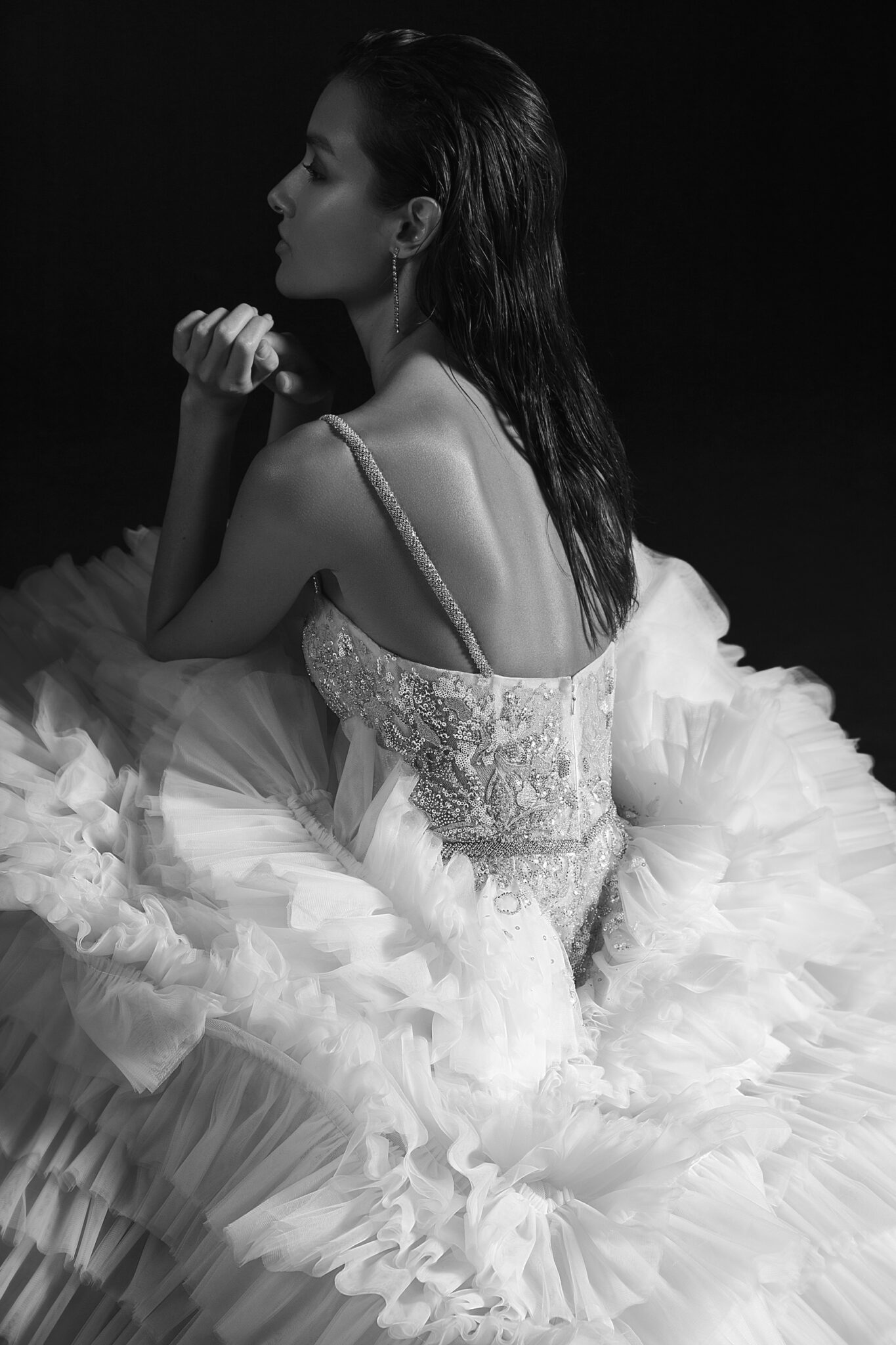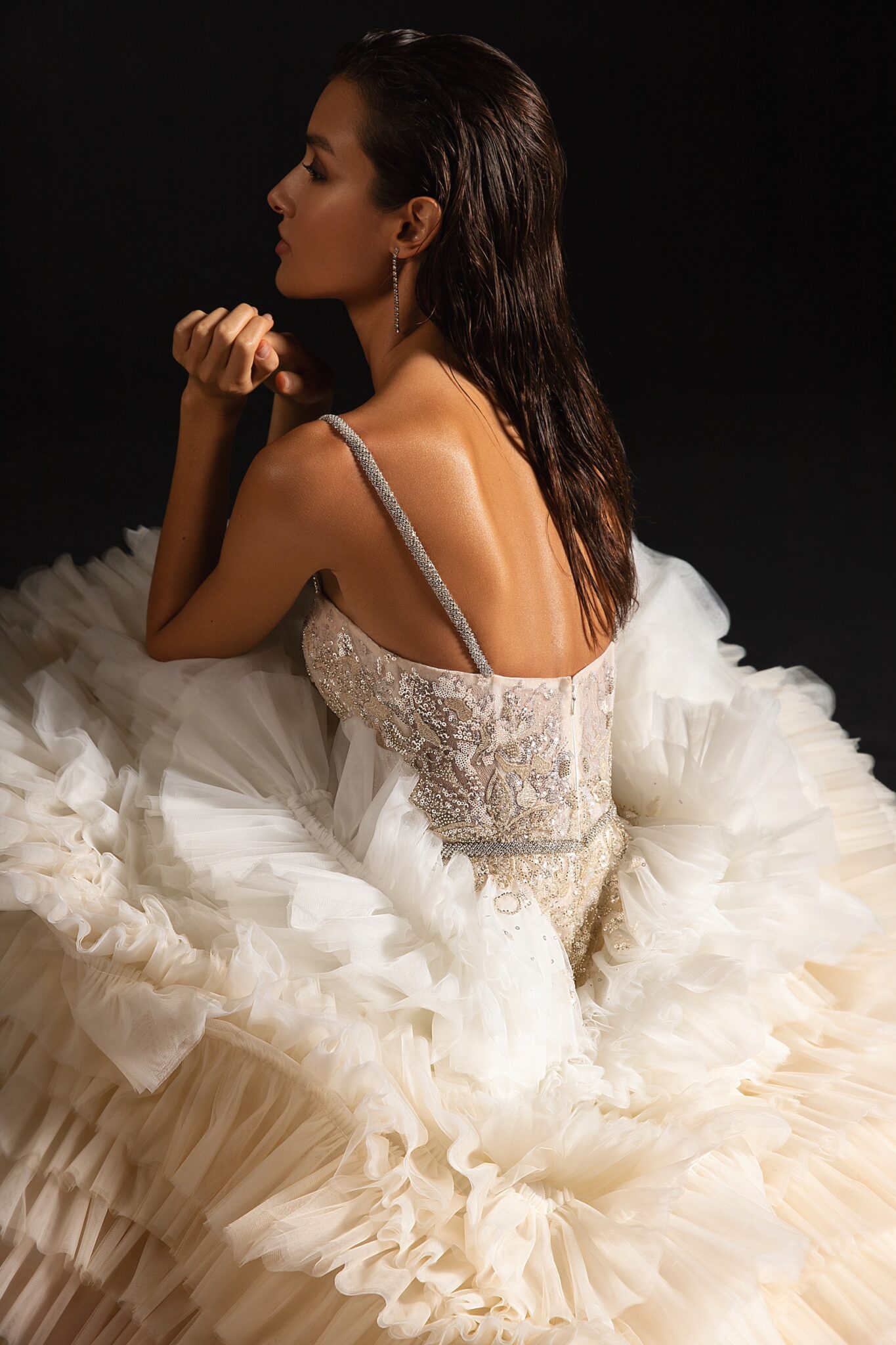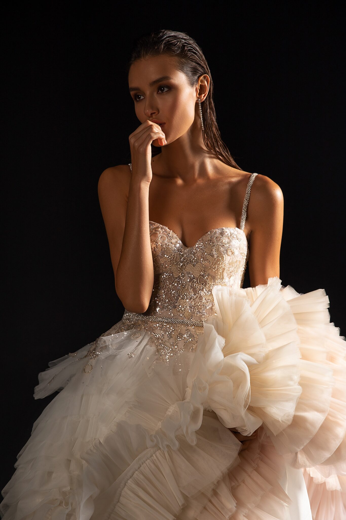 StardustA unique wedding gown with a fabulous train made of ruffles colorated in different shades of soft pink.. The corset of the dress and the dress itself are made of sparkly fabrics. A sheath dress is embellished with a sweetheart neckline and thin shoulder straps.