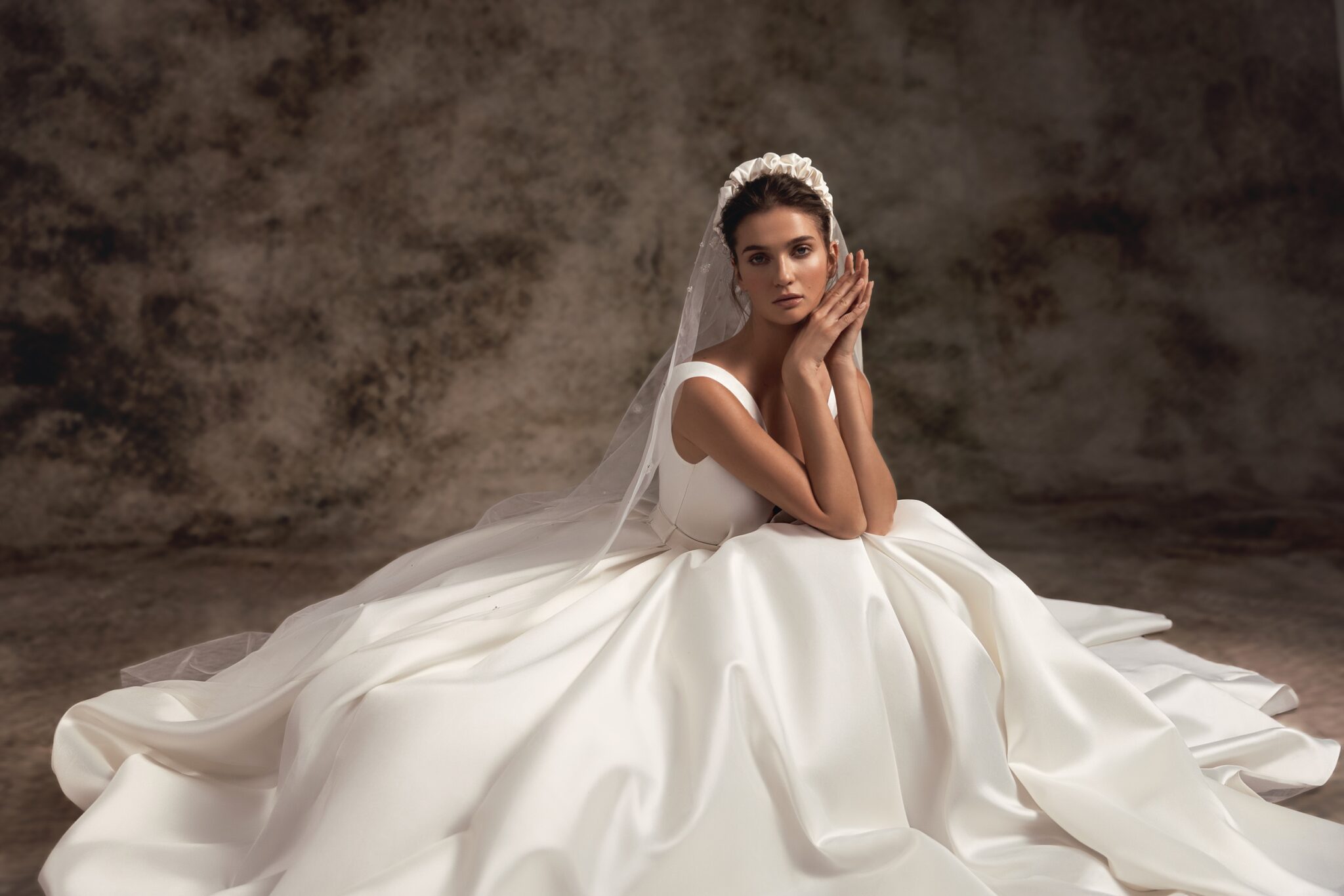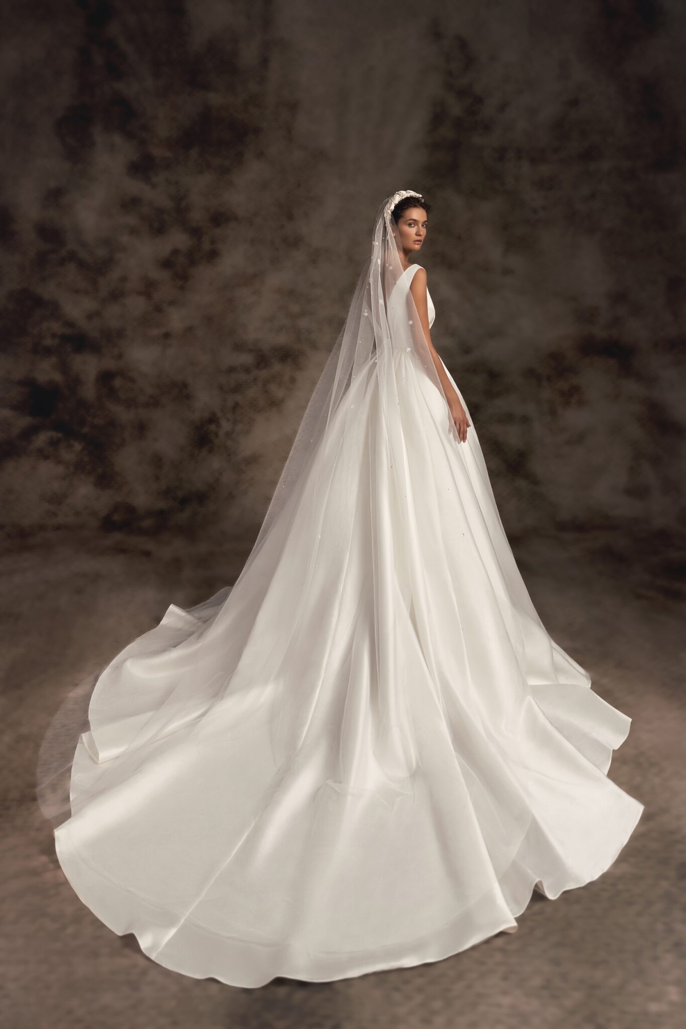 Notte d'OperaRosemary is an aluring and romantic statement satin ballgown with a deeply plunged V-neck corset with neat satin straps. The waistline is decorated with pleats and a belt with a buckle that accentuates the figure. A voluminous full satin skirt softly falls into a cathedral-length train.