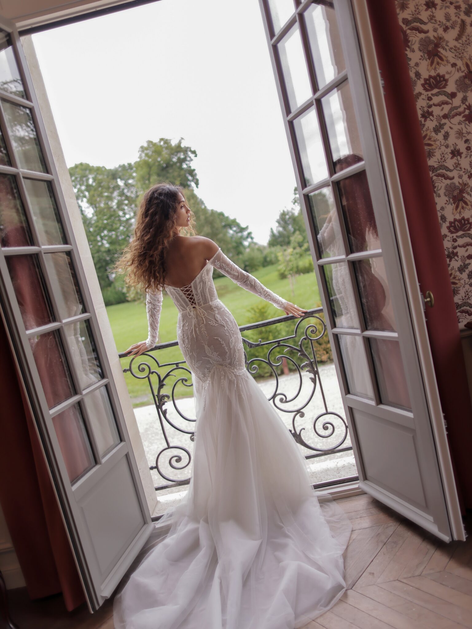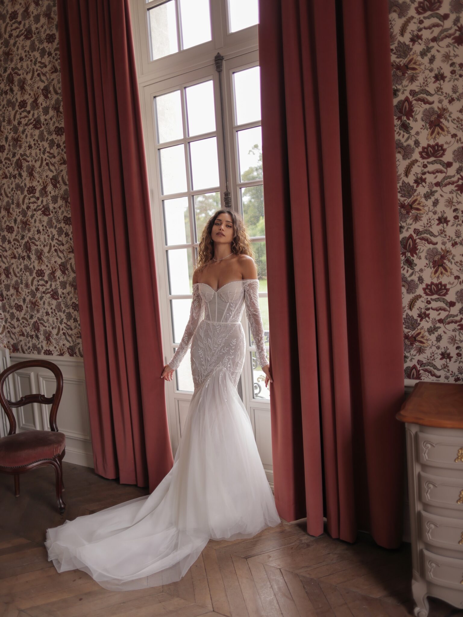 White SwanCold-shoulders mermaid gown crafted from semi-sheer fabric and decorated with floral embroideries and sparkling beads. The bodice features an outlined waist, while the hem of the skirt is a voluminous semi-sheer train descending from the hip level to the floor.