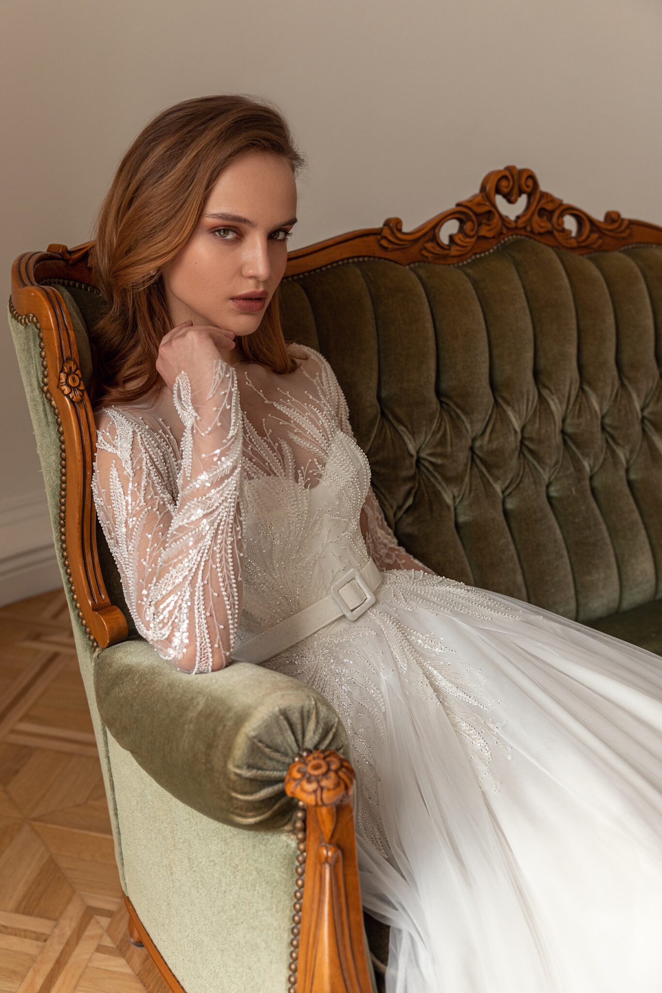 Less is more 2022Sabrina is a stunning A-line wedding gown with a long train. A dress is made of veiling with lace decorations. The corset is entirely embroidered with beads and spangles. It is embellished with heart-shaped low neck covered with embroidered lace. The tender long transparent sleeves are all embroidered with beads and crystals with floral pattern. A skirt is made of the same shining fabric and veiling. It goes into a long train.