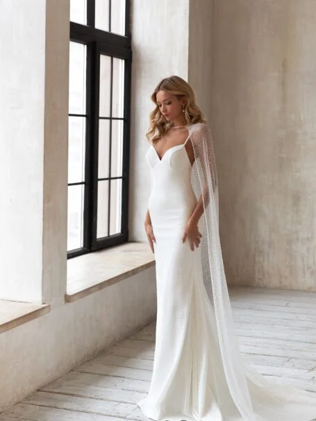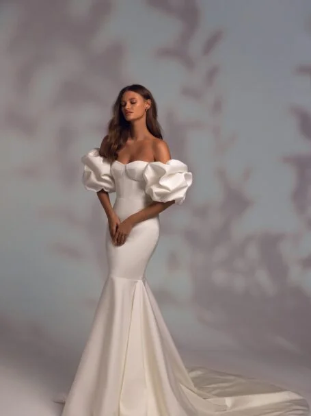 Less is more 2022, Sample SaleSamanta is a fabulous wedding gown made of the lightweight fabric. A dress with strapless draped corset and lowered shoulders with elbow length volumetric sleeves is decorated with V-neckline with pointed take-ups. A wide waistband made of the same fabric and tied into a bow accentuates the bride’s figure. The exquisite volumetric skirt passes into a long train.