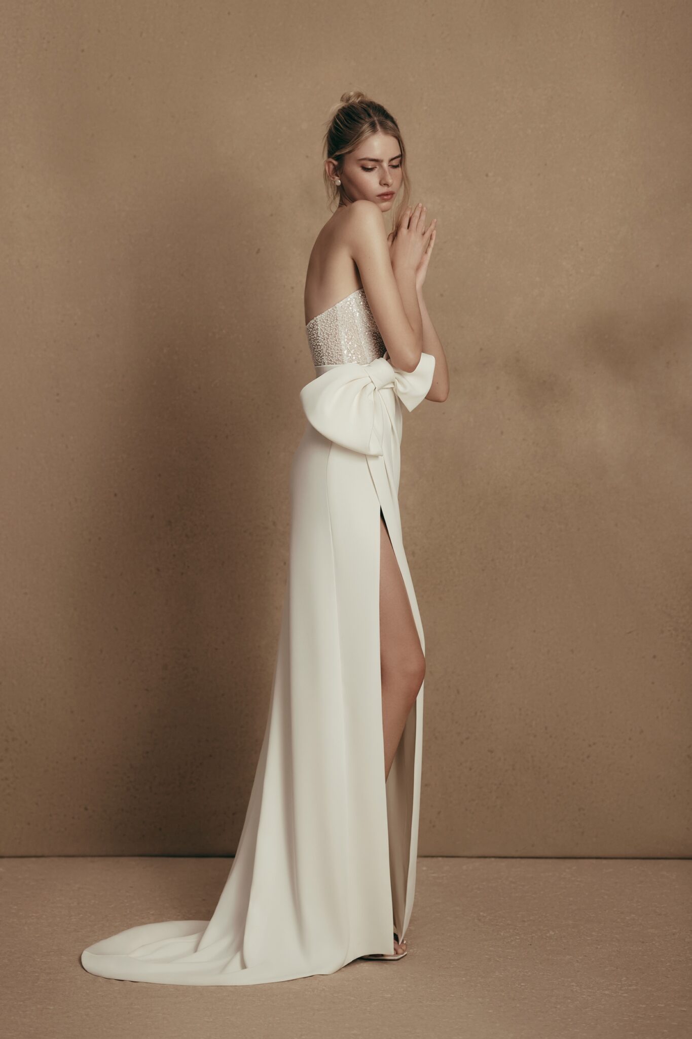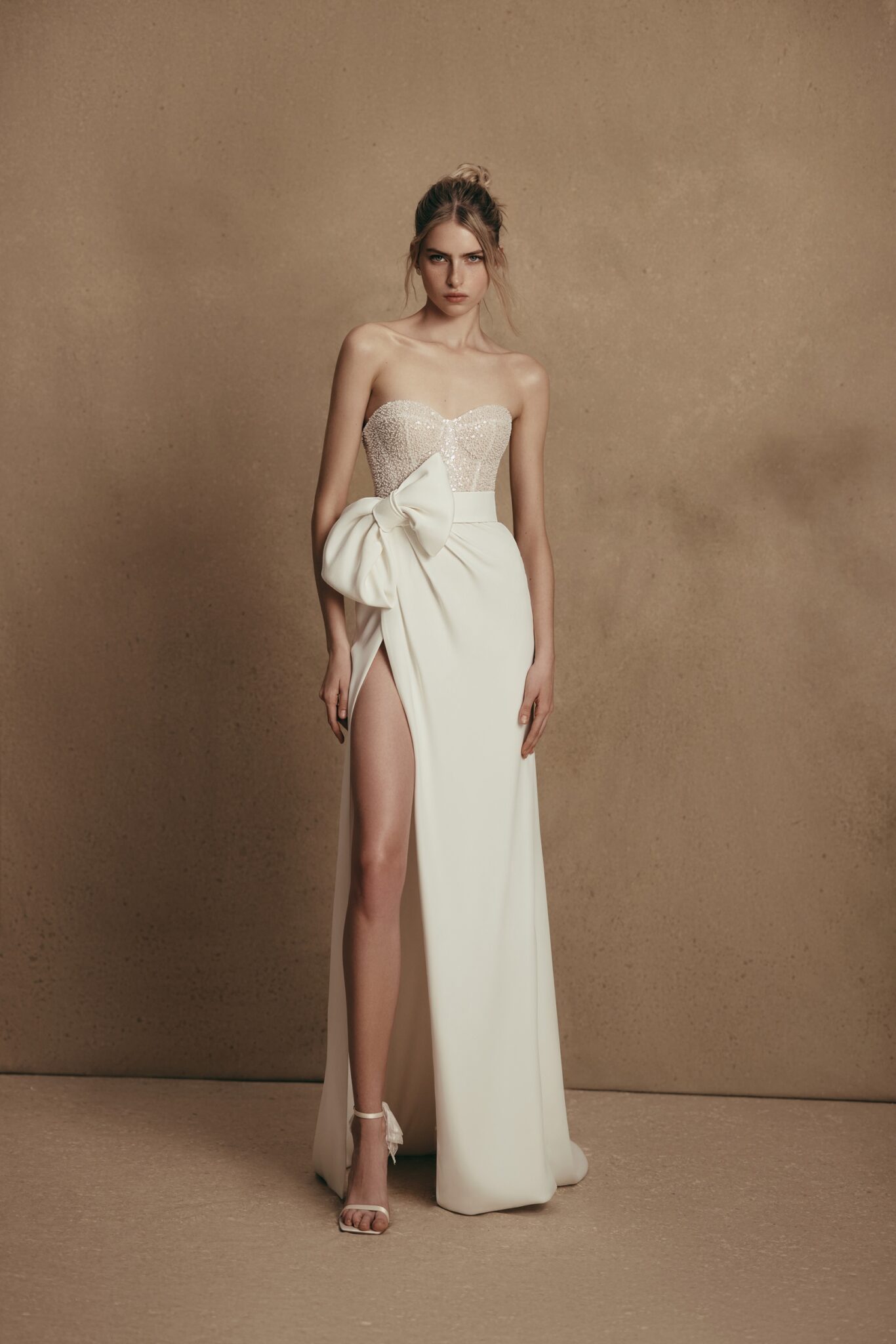 Personality, Sample SaleScarlet is a majestic wedding gown made of glossy satin and sequined fabric. The strapless sweetheart corset is decorated with shining spangles. A Straight silhouette skirt with drapping features a high slit and an oversized bow on the waist.