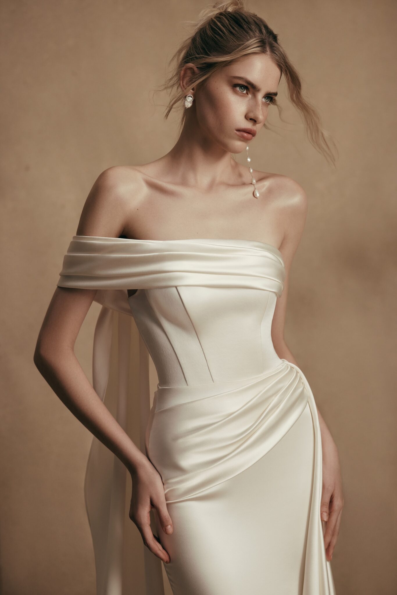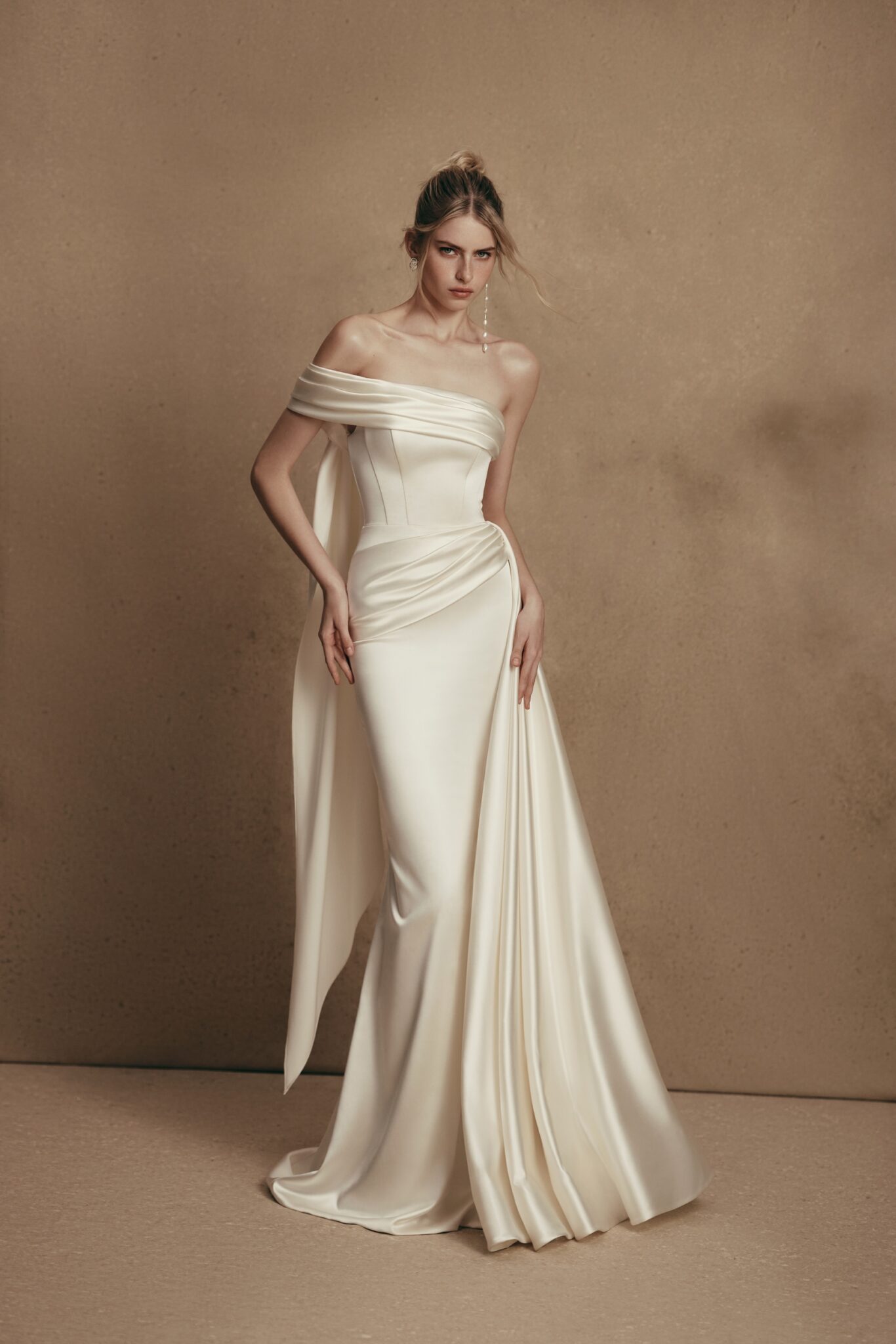 PersonalityLuxorious bridal gown with an asymmetric cape. The dress is made of soft satin, the corset is decorated with draping. The top has asymmetric neckline and is fixed on one wide strap. The sheath skirt is of Straight silhouette but the additional skirt has an asymmetric cut.