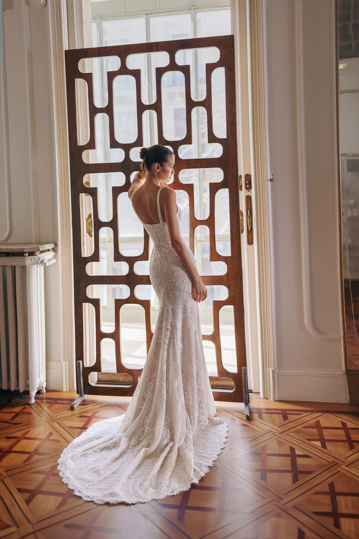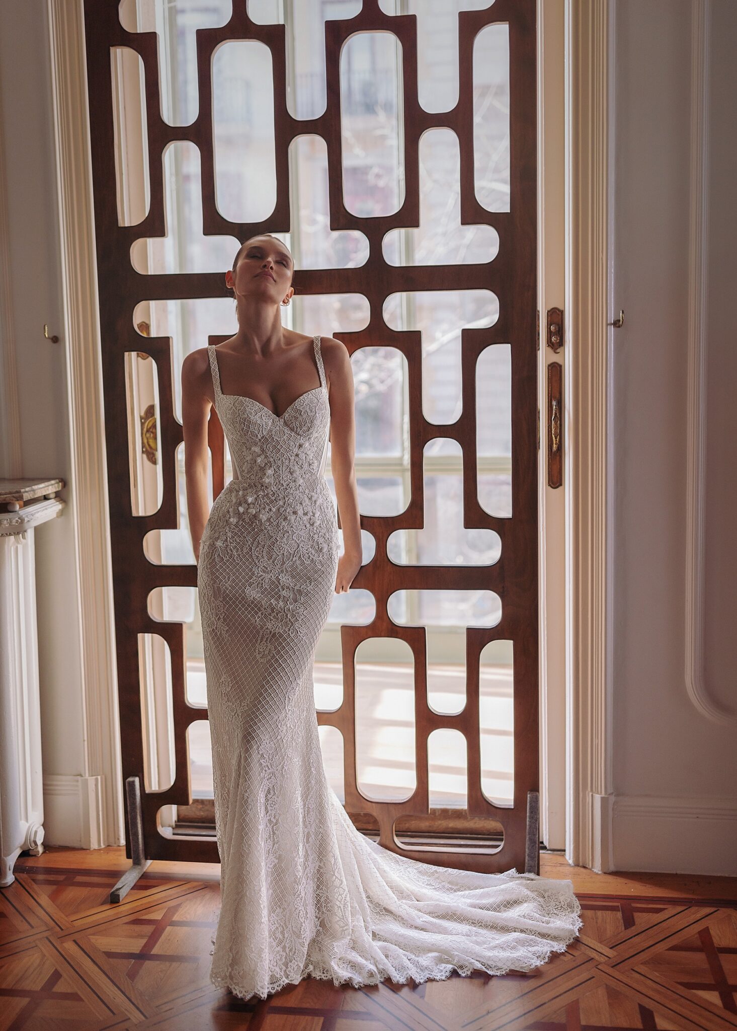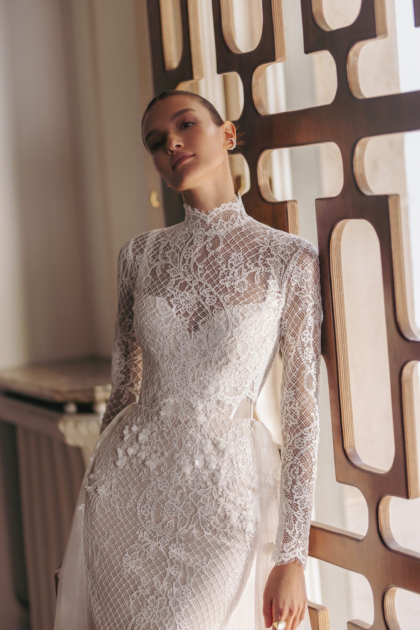 GeminiSequoia — strapped heart-shaped neckline mermaid silhouette dress with handicraft embroideries featuring small outlined flowers and guipure lace overlay. Complemented with detachable turtle neck bolero made of guipure lace.