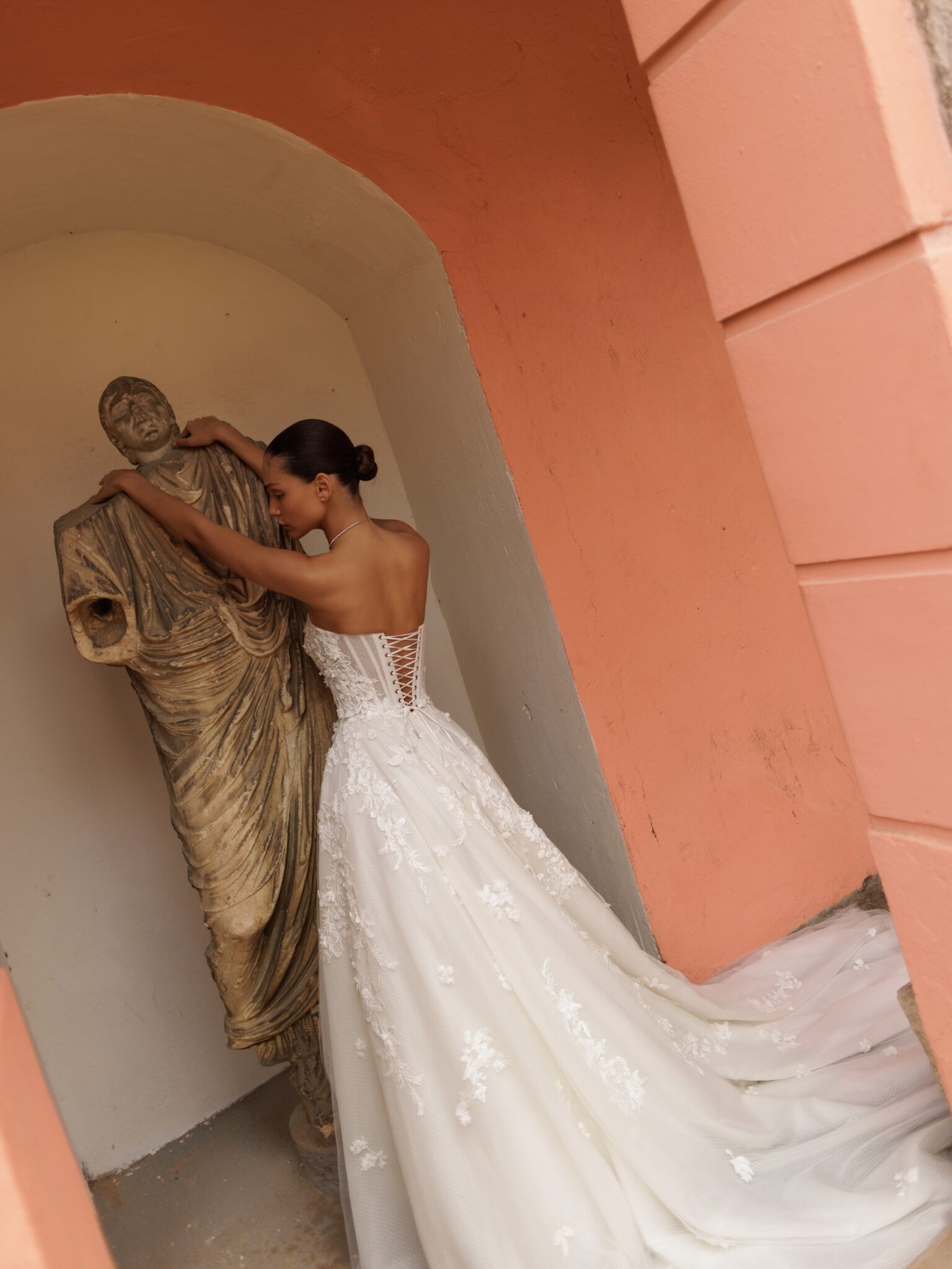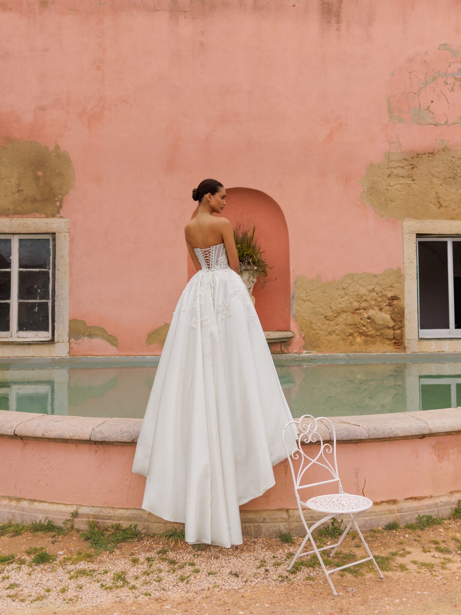 Bridal AlchemyA-line silhouette dress made of Chantilly lace with delicate applications on the corset. The dress includes a detachable train, which is securely fastened with hidden buttons at the waist. The train is crafted from luxurious Mikado fabric and elegantly adorned with lace on top.