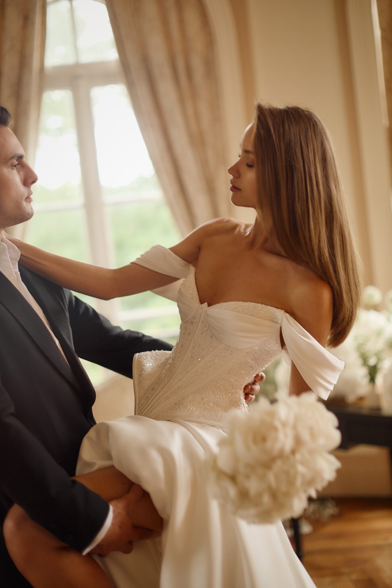 Love StoryOff-the-shoulders A-line gown with a peplum beaded corset and a smooth heart-shaped neckline. The draped bustier and smooth skirt descending in graceful waves create elevated elegance touch.