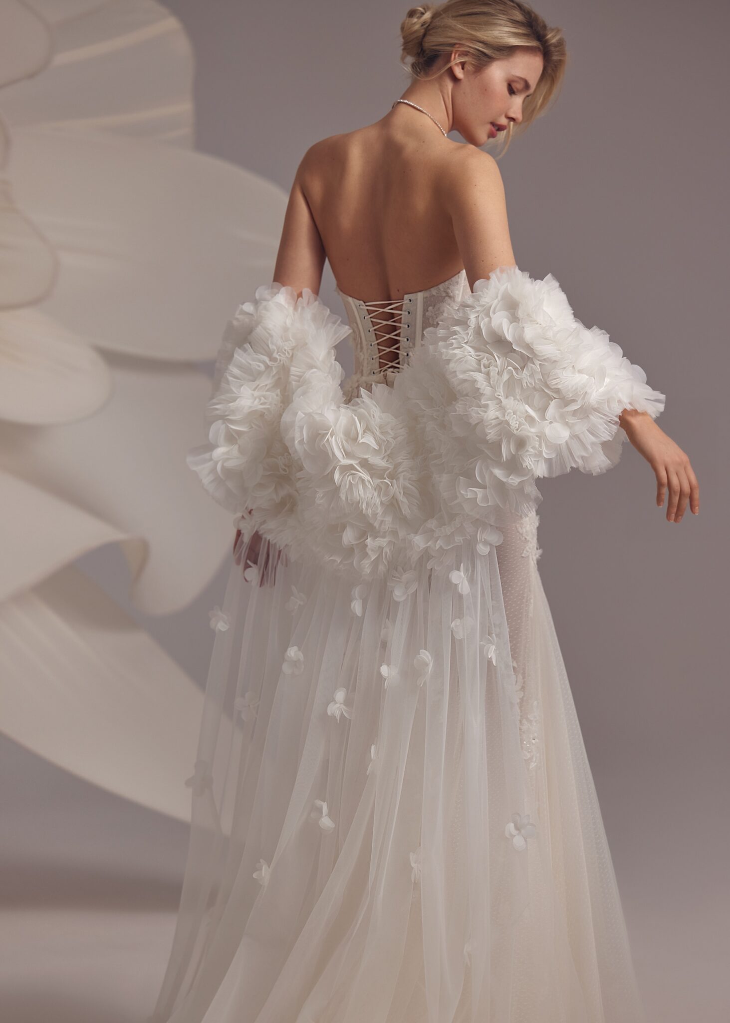 Less is More IVSheyniss – heart-shaped detailed corset dress covered with embroidered tuille and complemented with ruched tuille bolero extended with a floral embellished veil. Also can be complemented with lace fingerless long gloves.