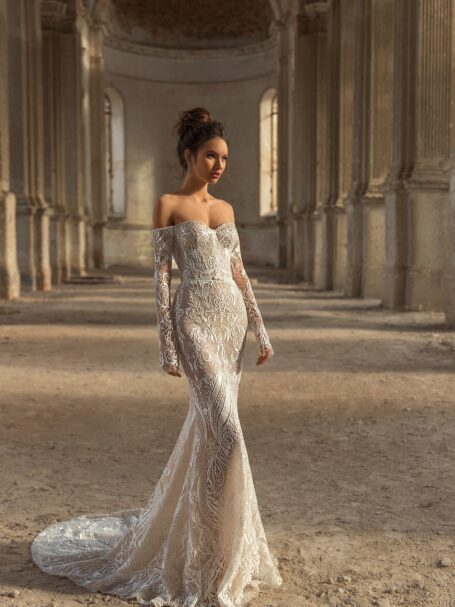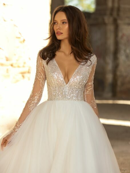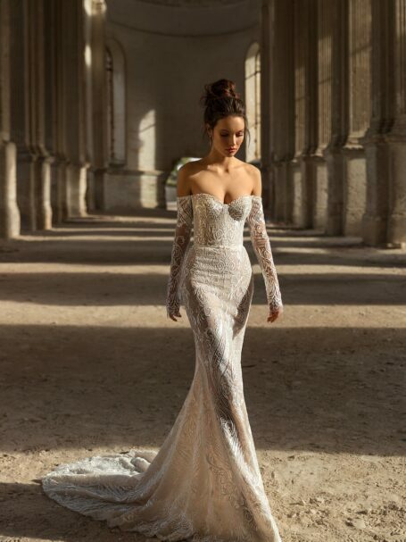 Golden Hour, Plus SizeSparkly Sky is a tender wedding dress with a sweetheart neckline and off shoulder sleeves. The corset is fully decorated with pearls.