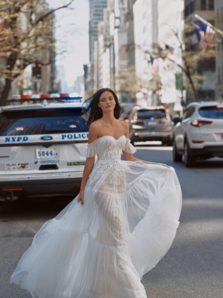 Love in the City, Plus SizeSkylar is the exquisite medmaid wedding gown. The upper part of the dress is decorated with a V-shaped neckline and has thin straps. The corset is entirely embroidered with beads, spangles, and crystals. A fitted skirt passes into a wide mermaid with a long train. The additional bolero, decorated with lace element, is fastened around the neck and ends with tender Tulle cape.