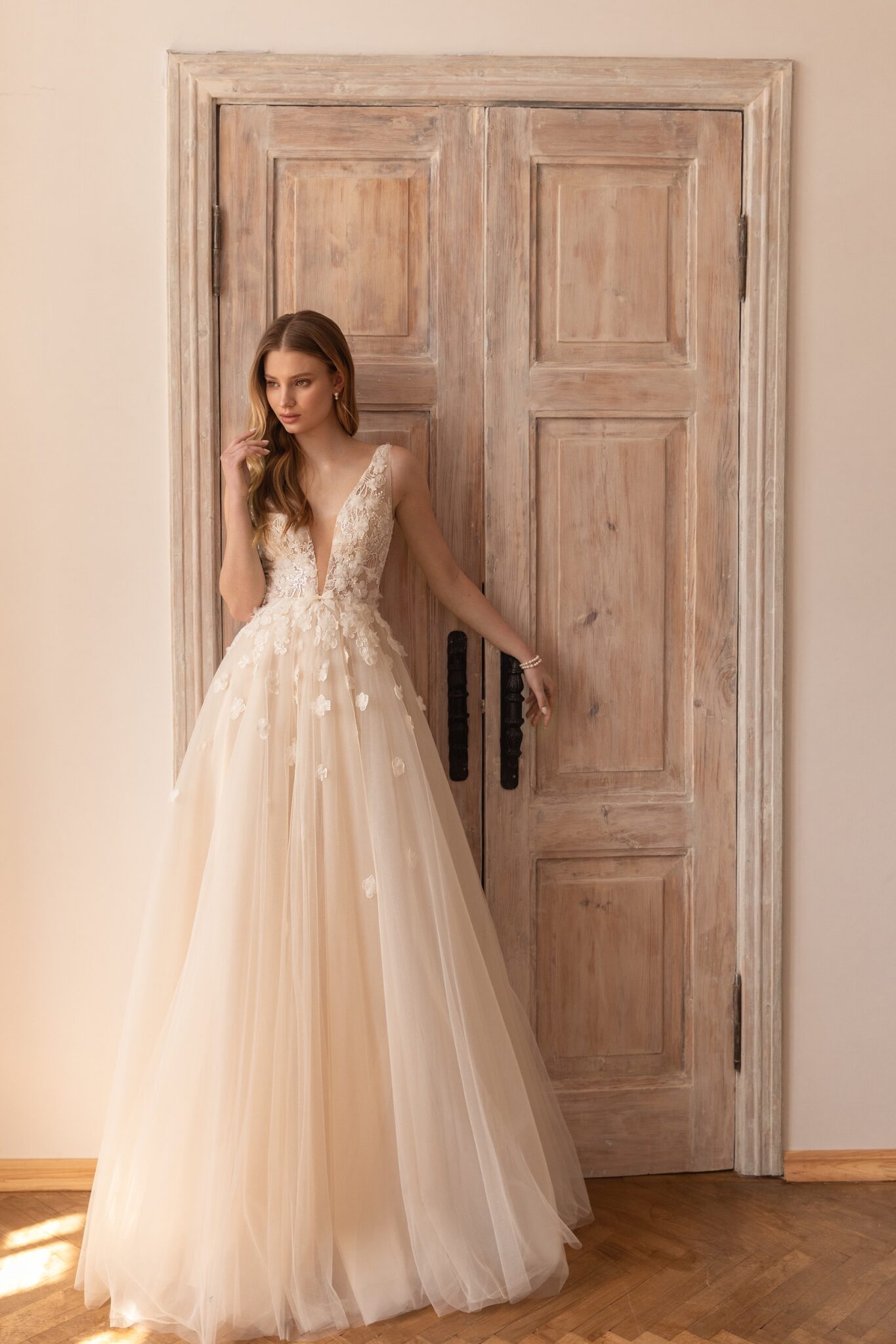 Less is more 2022Solomia is a tender wedding gown of A-line silhouette. The fragile corsage with V-shaped neckline and wide straps is embellished with 3D floral lace and small beads. The waistline is decorated with the same lace With flowers and small bow. The back neckline is V-shaped and the top combines the transparent lace and floral print. The loose veiling skirt has no train.