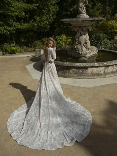 Lisbon VibesA-line Spell wedding dress is made of high-quality fabric. Hug shoulder runs into a big neckline at the back of a dress. Long sleeves are decorated with lace and sheer insets. A tail gives the finishing touches.