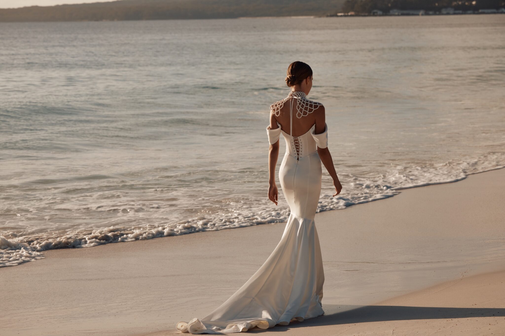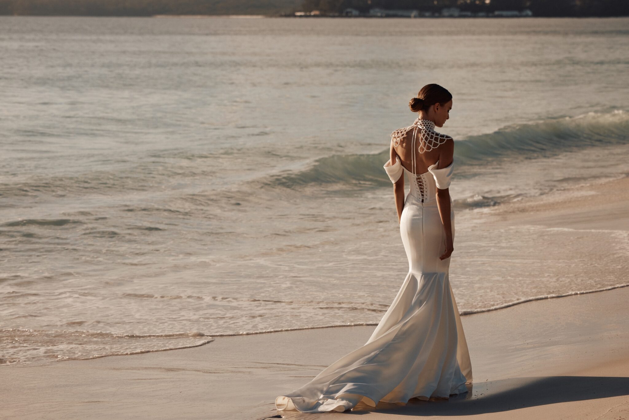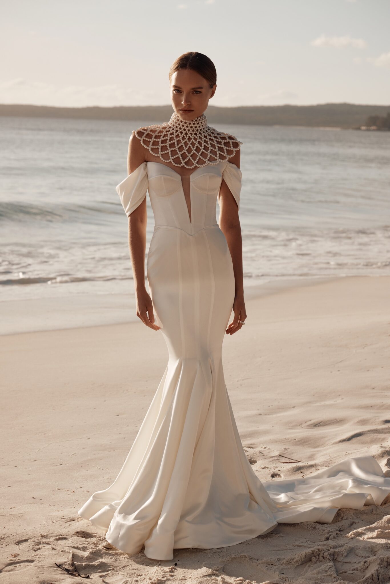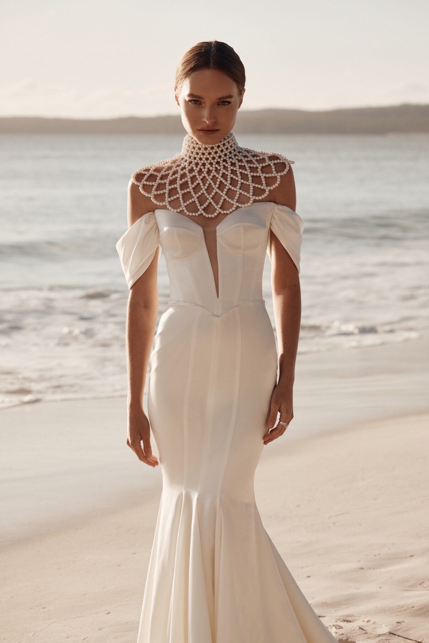 Atelier signature editionThis mermaid wedding dress exudes contemporary elegance with its sleek suit fabric and daring deep V-neckline. The small off-shoulder sleeves add a touch of sophistication. To top it off, a statement necklace-bolero made of lustrous pearls provides a bold, modern twist to this bridal ensemble, perfect for the bride who loves to embrace unique style.