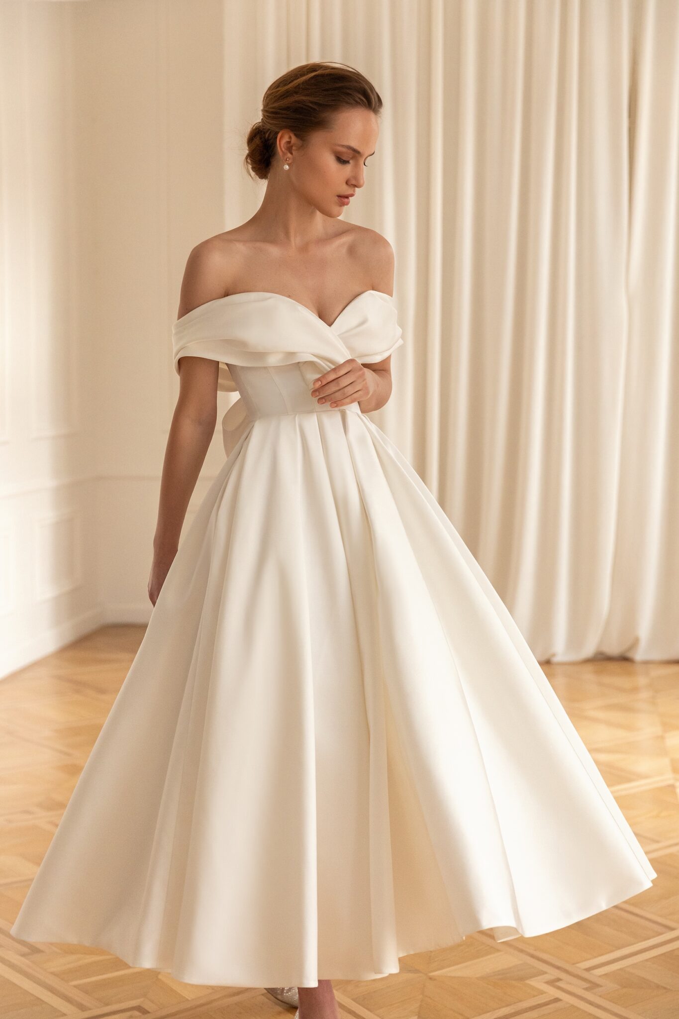 Less is more 2022Sweet is a pretty feminine wedding gown. The strapless corsage is made of soft mikado silk, decorated with lowered shoulders with wraps and sweetheart-neckline. The back of the dress exposes the bride’s back and is decorated with V-neckline and a big bow. The fantastic lush ball skirt of midi length is made of the same shining satin.