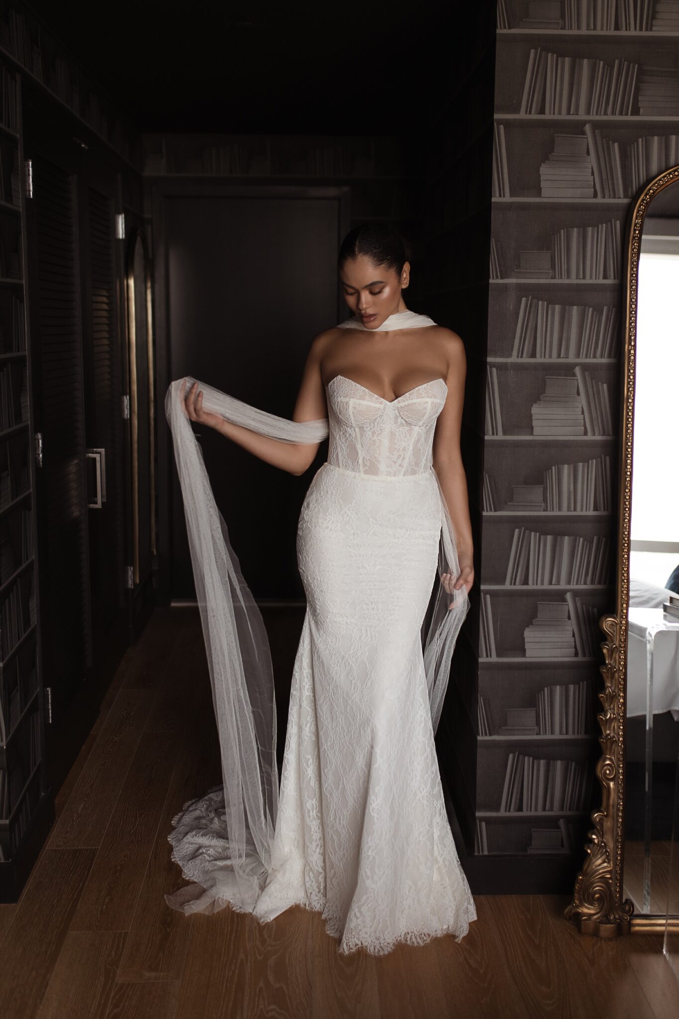 Urban EleganceThis romantic fit and flare gown is created with a soft Chantilly lace. The consistent pattern throughout the gown allows the dress to feel minimal, while also showcasing the fabrics intricate detail and texture. ‘Sylvia’ features a pointed corset bodice and scalloped edging along the hem of the gown. The satin covered buttons cascading down the train not only add dimension, but hint toward the classic bridal elements seen throughout the rest of the collection. ‘Sylvia’ can be styled in many different ways – including her matching off shoulder lace sleeves, a soft tulle cape, or either of the lace boleros paired with the ‘Marina’ gown.