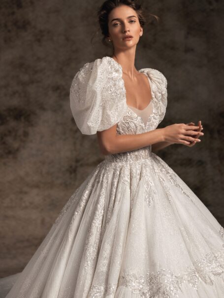 Notte d'Opera, Plus SizeAll embroidered lace wedding gown with sheer square neckline and long fitted floral lace sleeves with a tatoo effect. A voluminous full skirt is decorated with mini floral embroideries with beads and sequins that trickles down into a majestic cathedral-length train.