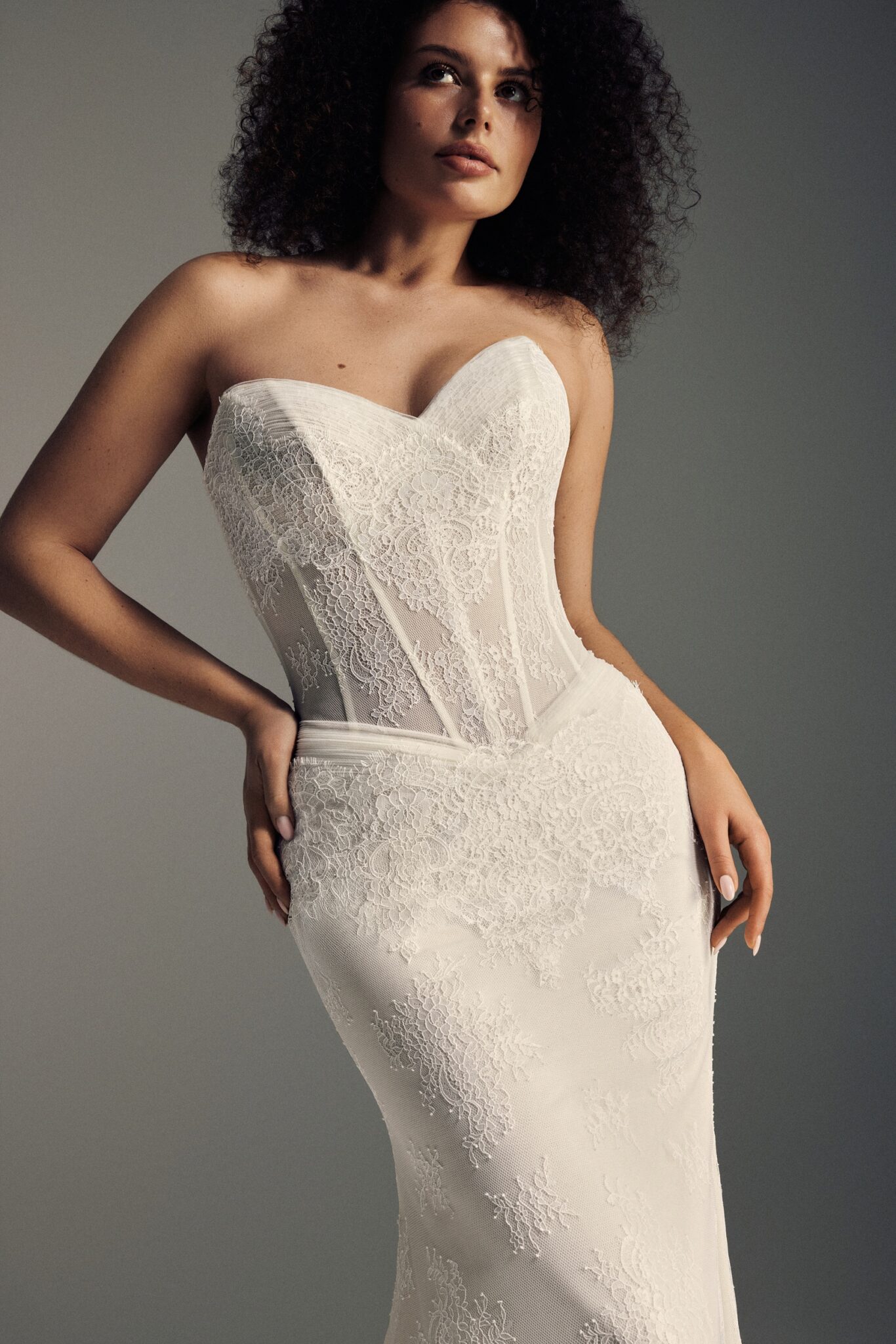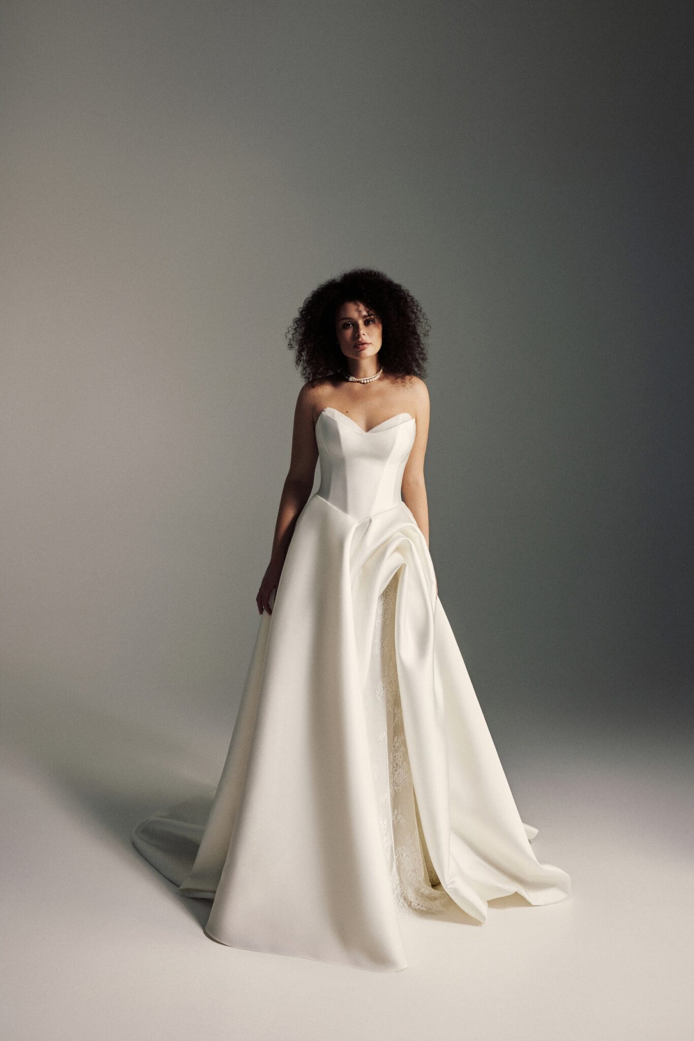 Blooming LoveTena is a versatile and modern bridal ensemble designed for both drama and intimacy. The outer layer, crafted in lustrous mikado silk with an A-line silhouette, features a pointed V-neckline, soft draping at the waist that creates a subtle slit, lacing at the back, and a flowing cathedral-length train. Underneath, a structured lace sheath dress with a corset and chapel train can be worn on its own, offering a refined, effortless look for later in the celebration.