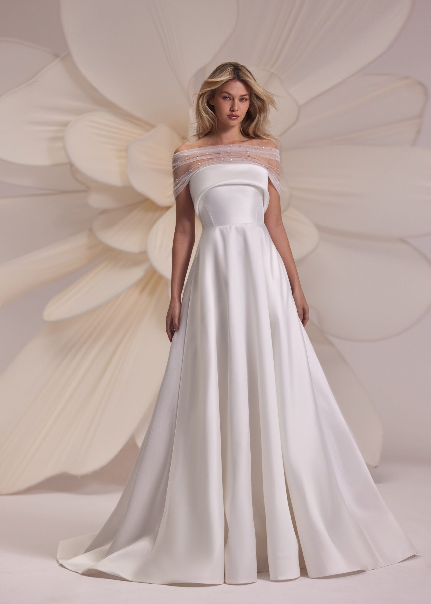 Less is More IVTeya – smooth strapless A-line dress decorated with a crystal line on the back and complemented with tuille cold-shoulder bolero.