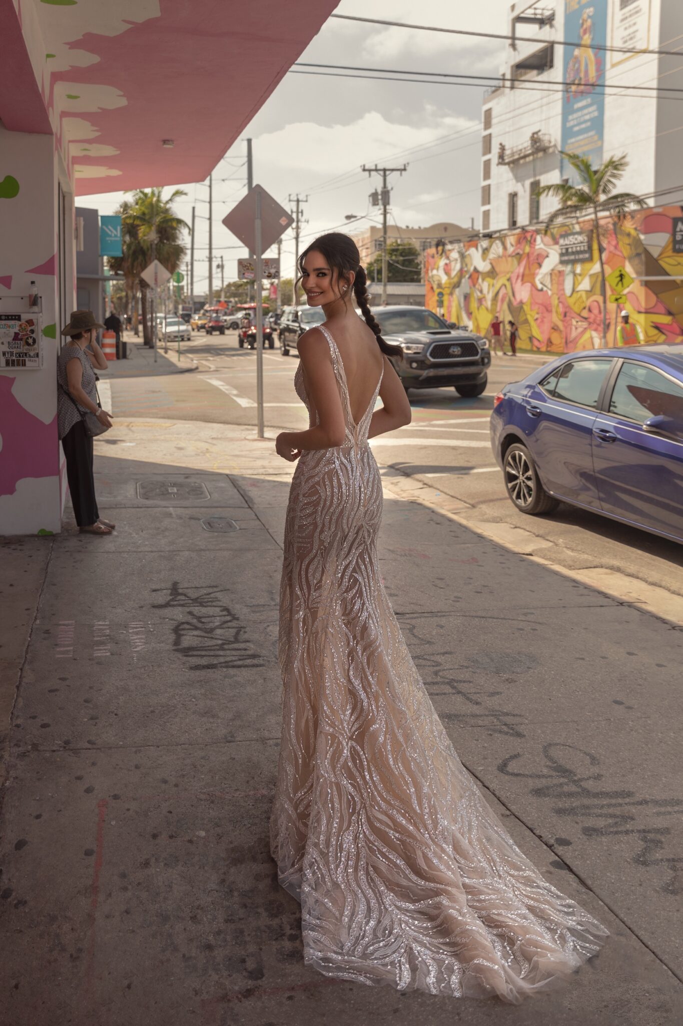 MiamiTilda is a sheath wedding gown with a long train. A dress is made of beige veiling with white floral ornament. It is entirely embroidered with beads and spangles. A V-shaped low neck and a deep neckline at the back of the dress add tenderness. There are cuts under arms. A belt of beads accentuates a waistline.